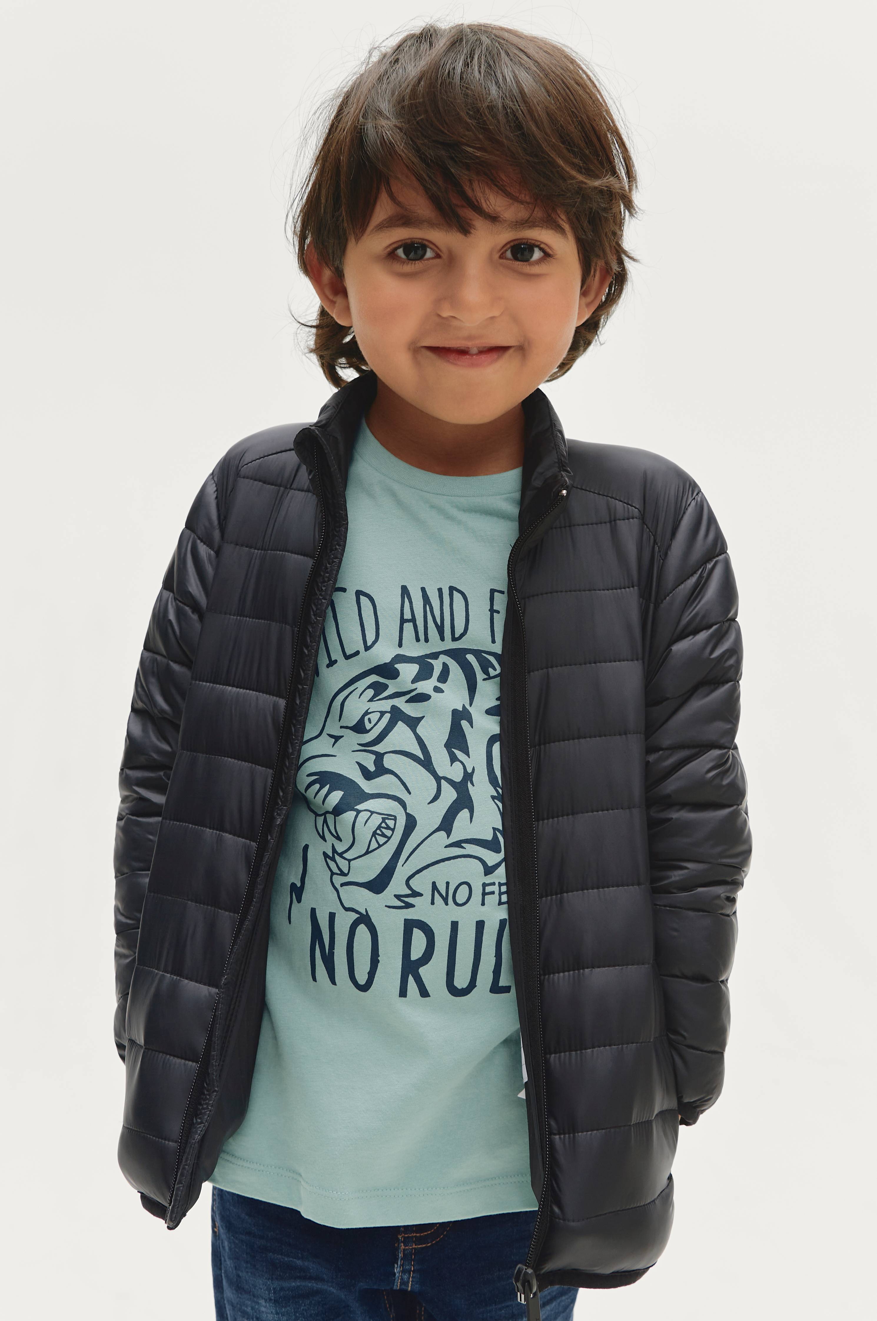 En quiltet og vatteret letvægtsjakke med smal pasform. Vævet yderstof og vattering i genindvundet polyester. Lukning med lynlås. To yderlommer og to inderlommer. Elastisk kantbånd i ærmekant og kanten forneden.