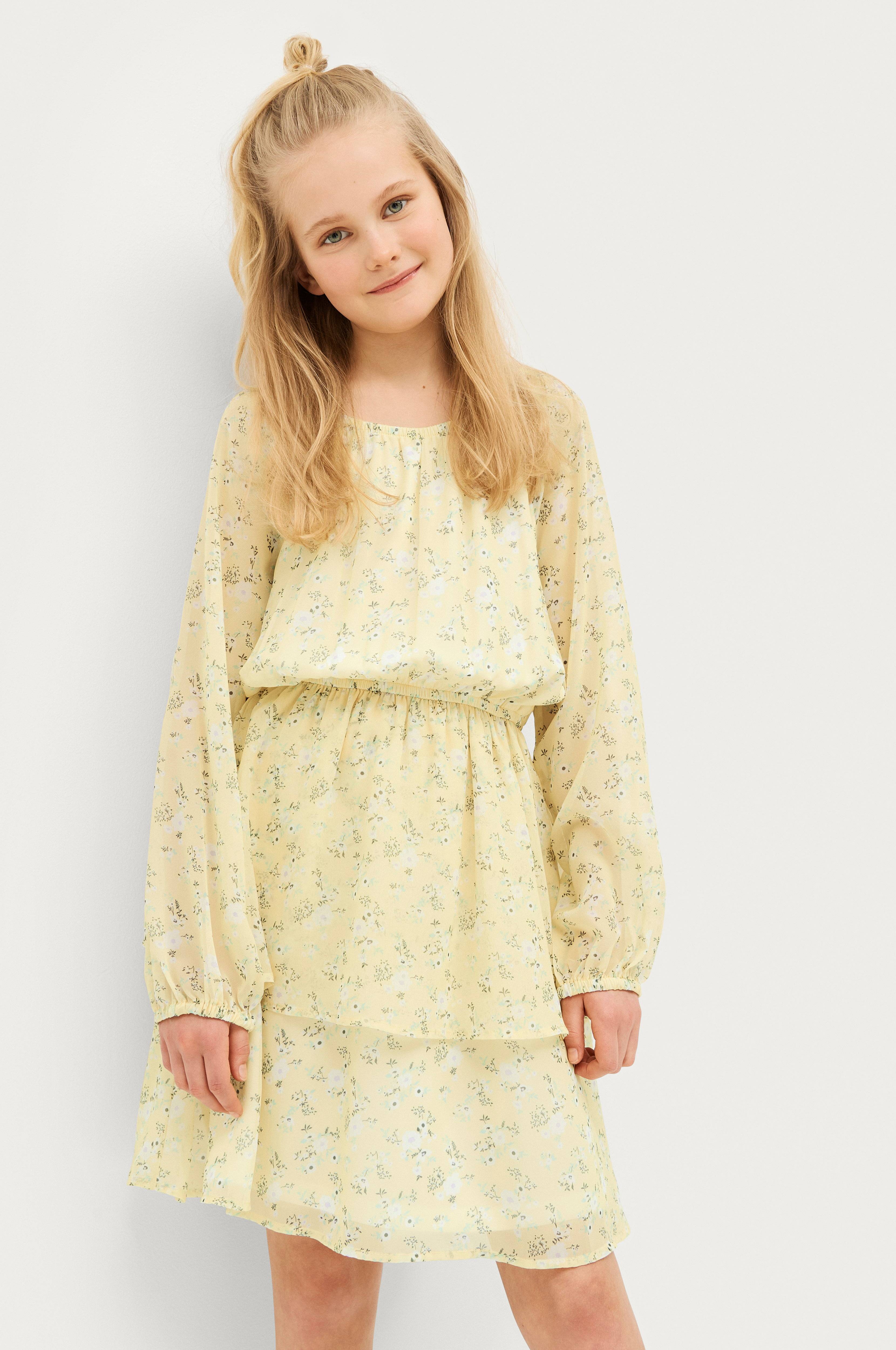 - Flæsekjole - Elastisk halsudskæring - Transparentae ballonærmer med elastiske ærmekanter - Elastisk talje - Flæser - Lavet af chiffon - Jerseyfor - Produktet indeholder genindvundet materiale, som genbruges for at reducere mængden af affald samtidigt med at der ikke anvendes nye ressourcer.