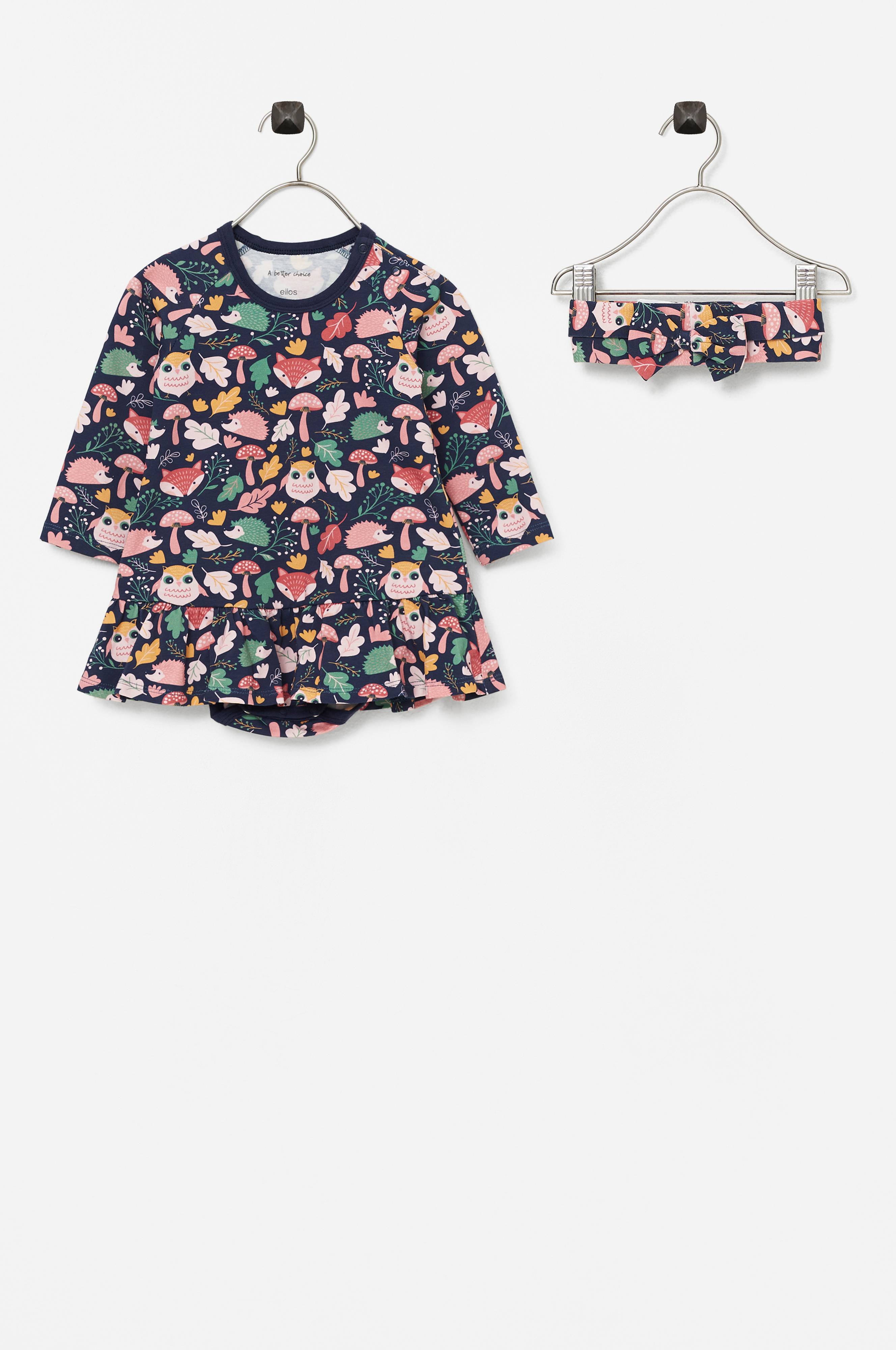 Kjole i blød stretchjersey af økologisk bomuld med matchende hårbånd i samme kvalitet. Kjolen har rund hals, lange ærmer og flæse i kanten forneden. Hårbåndet har en påsyet sløjfe.