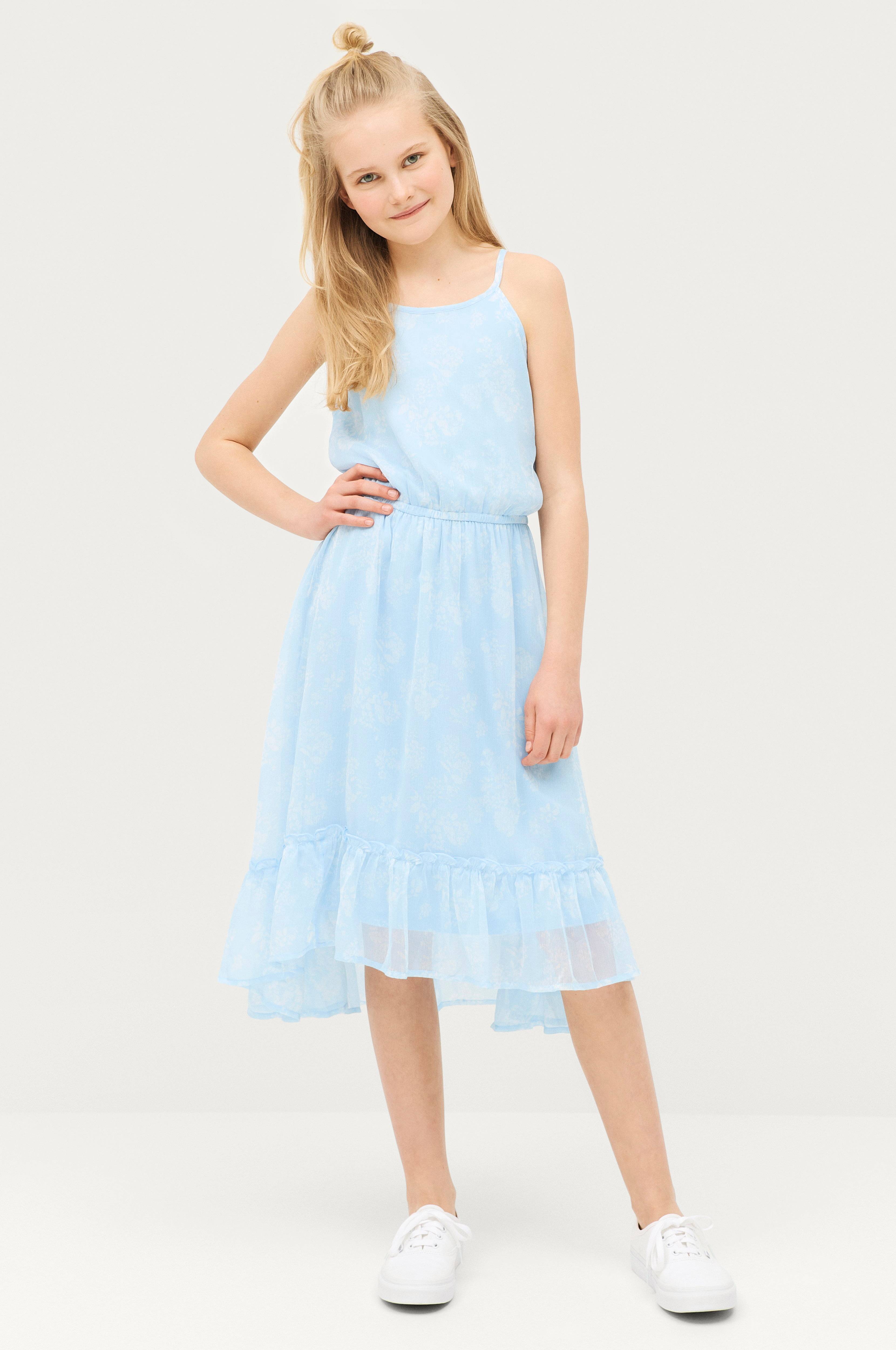 • Foret, ærmeløs kjole i chiffon med printet blomstermønster • Nøglehulsåbning med knap i nakken • Elastisk udskæring ved taljen • Volanter på skørtet • For i strækjersey • Produktet indeholder genindvundet materiale, som genbruges for at reducere mængden af affald samtidigt med at der ikke anvendes nye ressourcer.