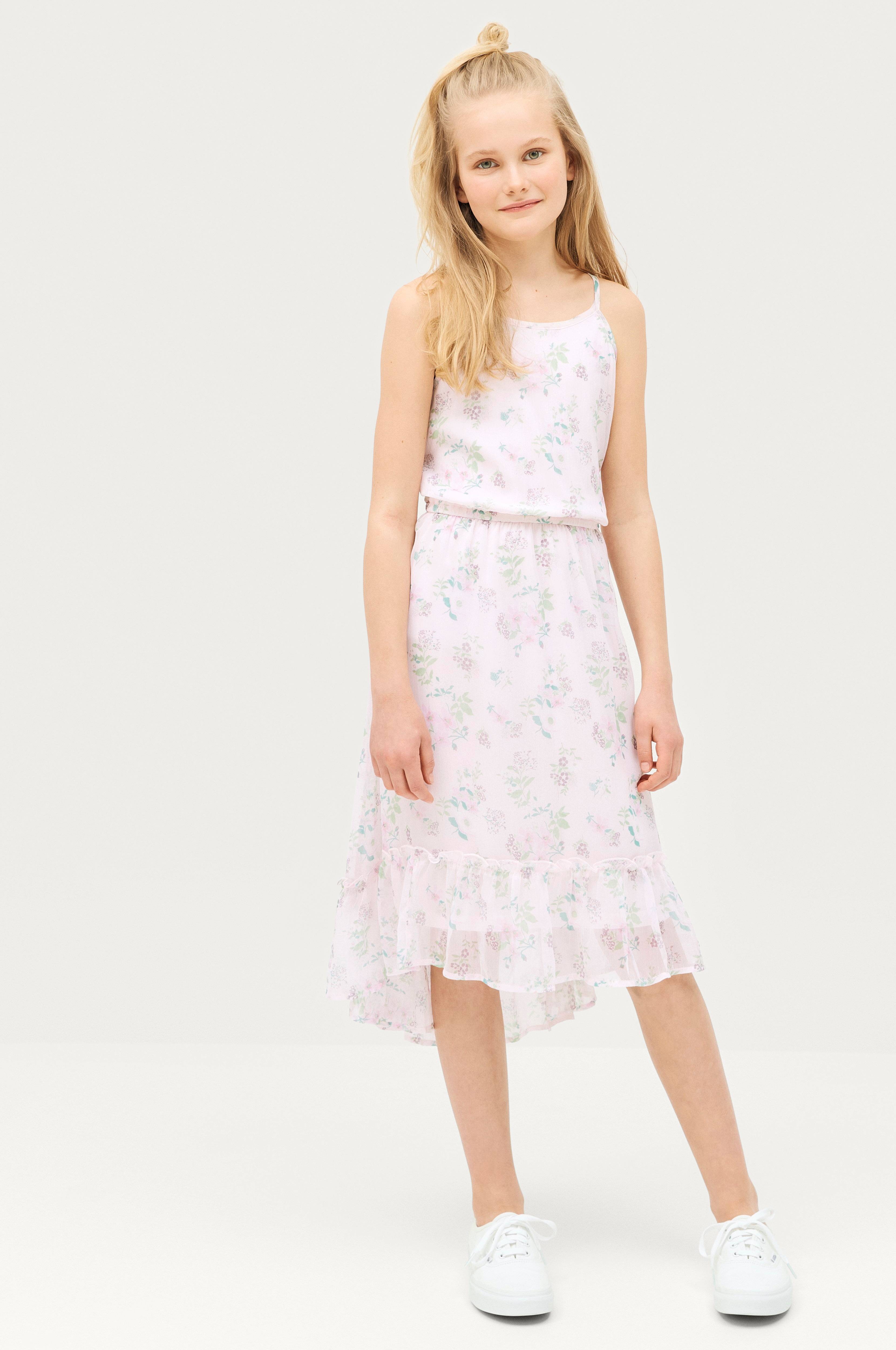 • Foret, ærmeløs kjole i chiffon med printet blomstermønster • Nøglehulsåbning med knap i nakken • Elastisk udskæring ved taljen • Volanter på skørtet • For i strækjersey • Produktet indeholder genindvundet materiale, som genbruges for at reducere mængden af affald samtidigt med at der ikke anvendes nye ressourcer.