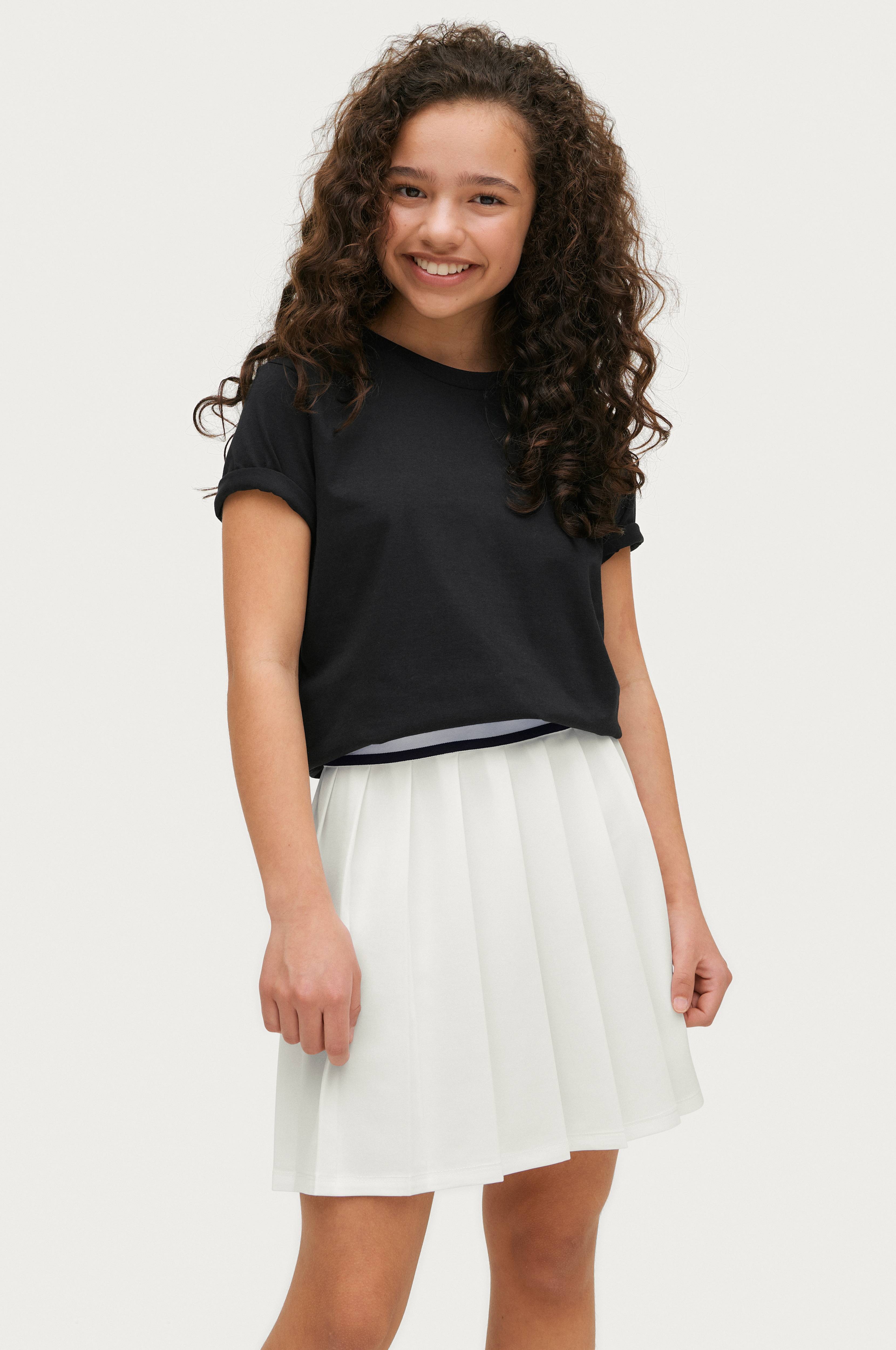 • Plisseret nederdel• Stribet elastisk bånd ved taljen