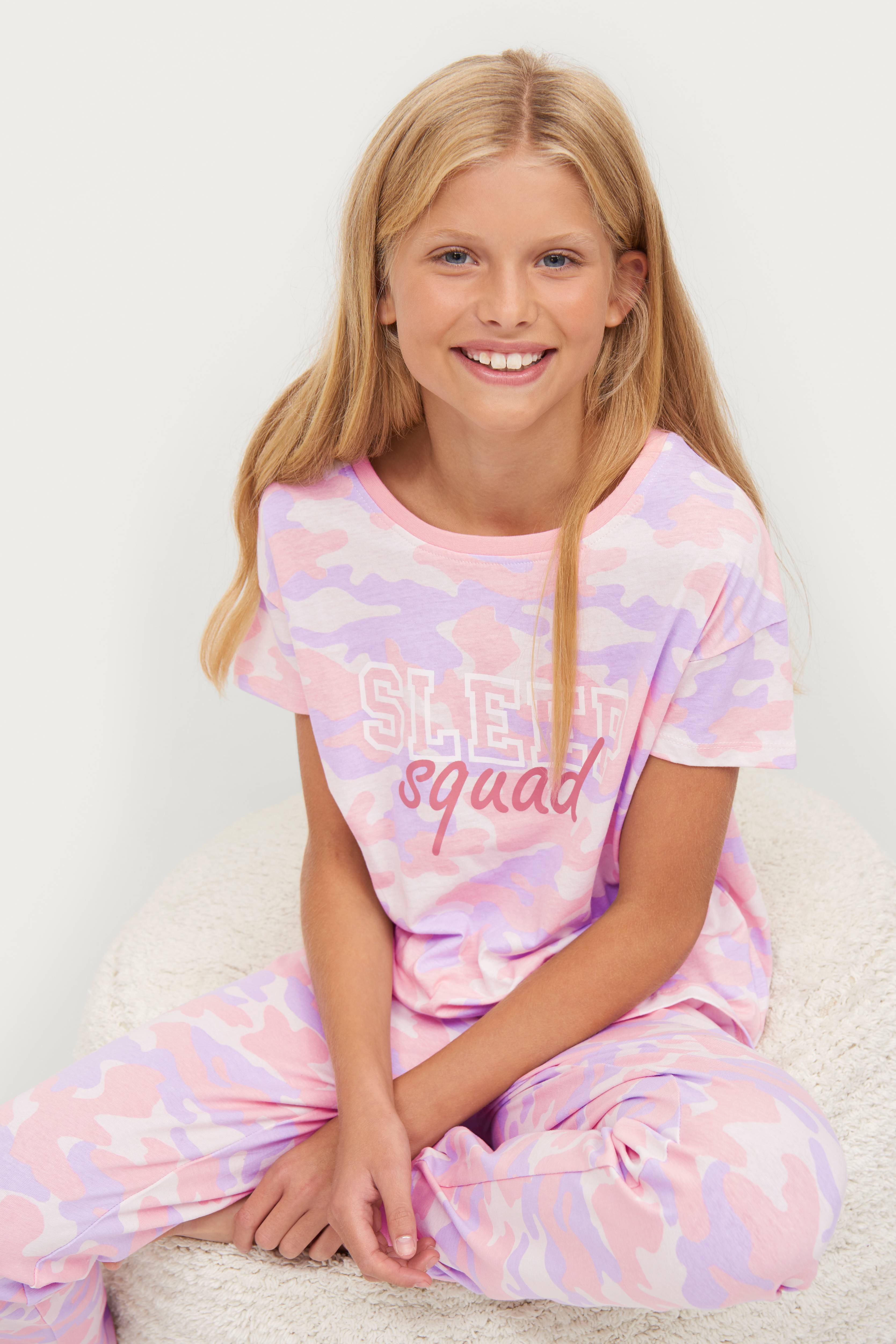 Pyjamas i blød bomuldsjersey med printet mønster. Kortærmet top med rund halsudskæring. Bukser med elastiktalje og ribkant i benkanten.