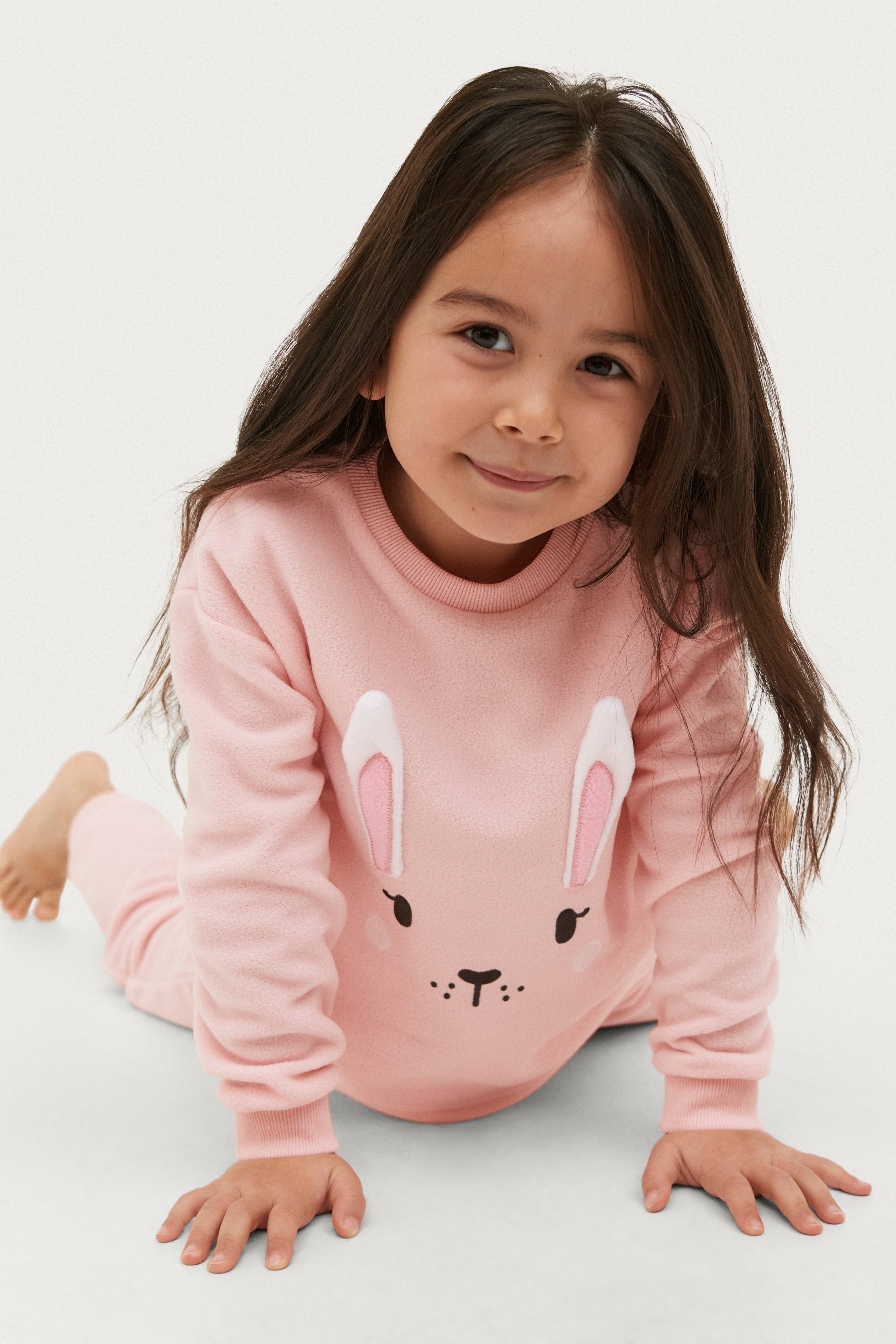 Pyjamassæt i blød fleece med langærmet trøje og bukser. Trøjen har en rund hals med ribkant samt ribkant i ærmekant. Broderi og påsyet applikation foran. Bukserne har ribbet, elastisk linning med løbegang og ribkanter i benkant.