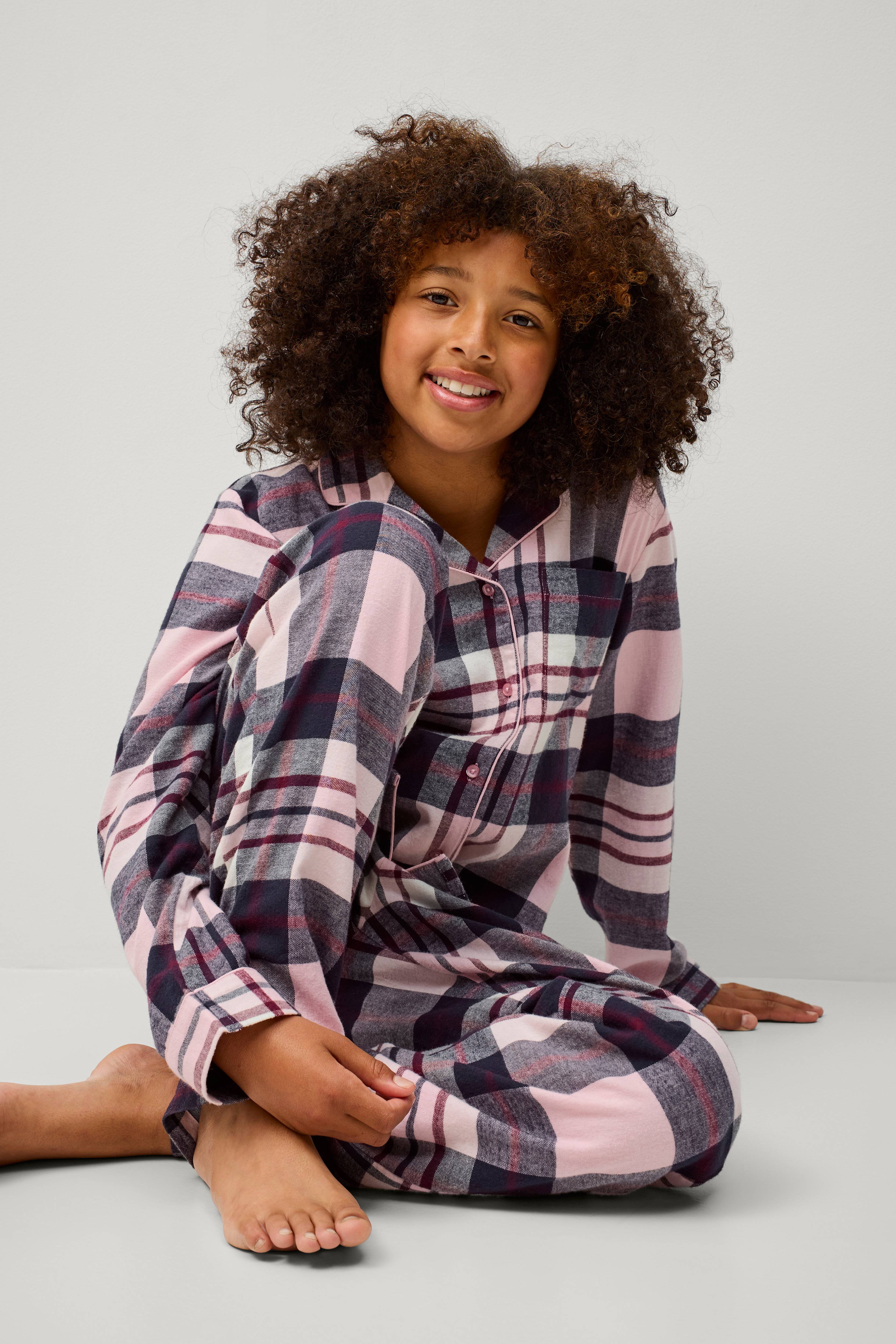 • 2-delt pyjamassæt i bomuldsflannel• Skjorte med krave og revers• Knapper• Brystlomme• Langt ærme• Bukser med elastisk bånd og træksnørre ved taljen• Indlagte sidelommer