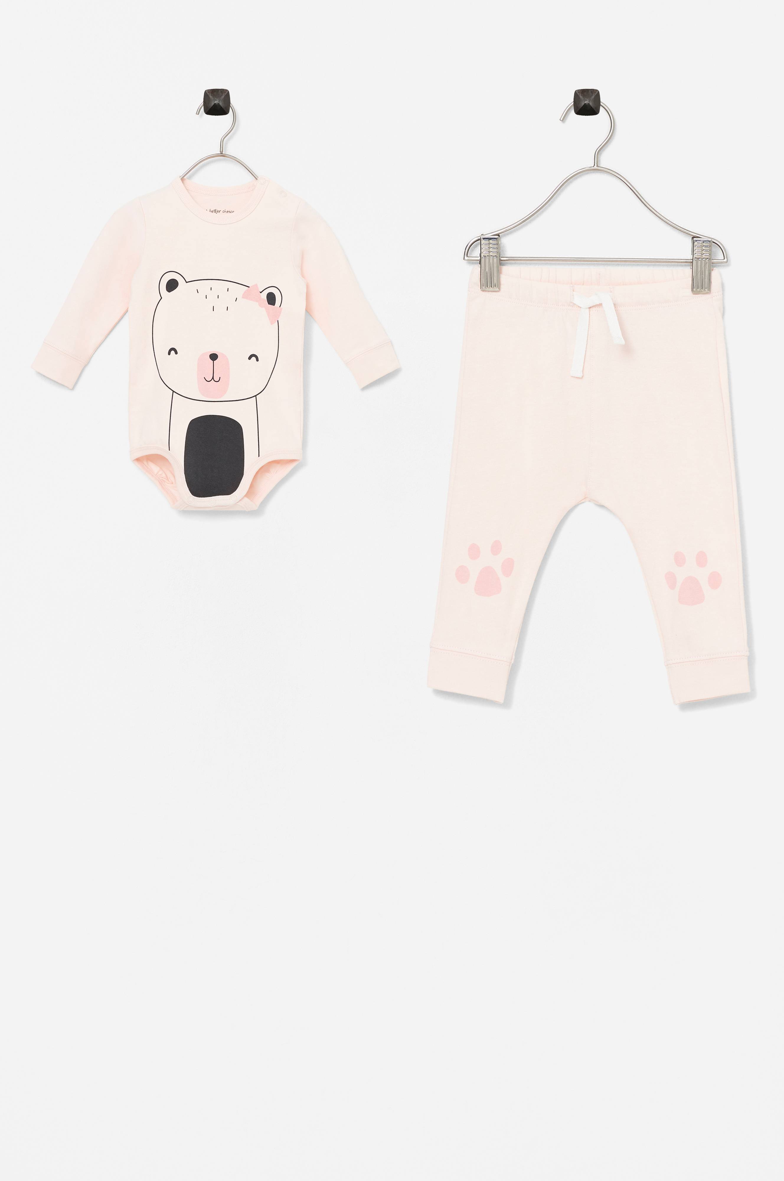 Sæt i blød bomuldsjersey med stretch til baby. Langærmet body med rund halsudskæring. Trykknapper på den ene skulder og i skridtet. Bukserne har elastisk talje med løbegang og ribkant i benkant.