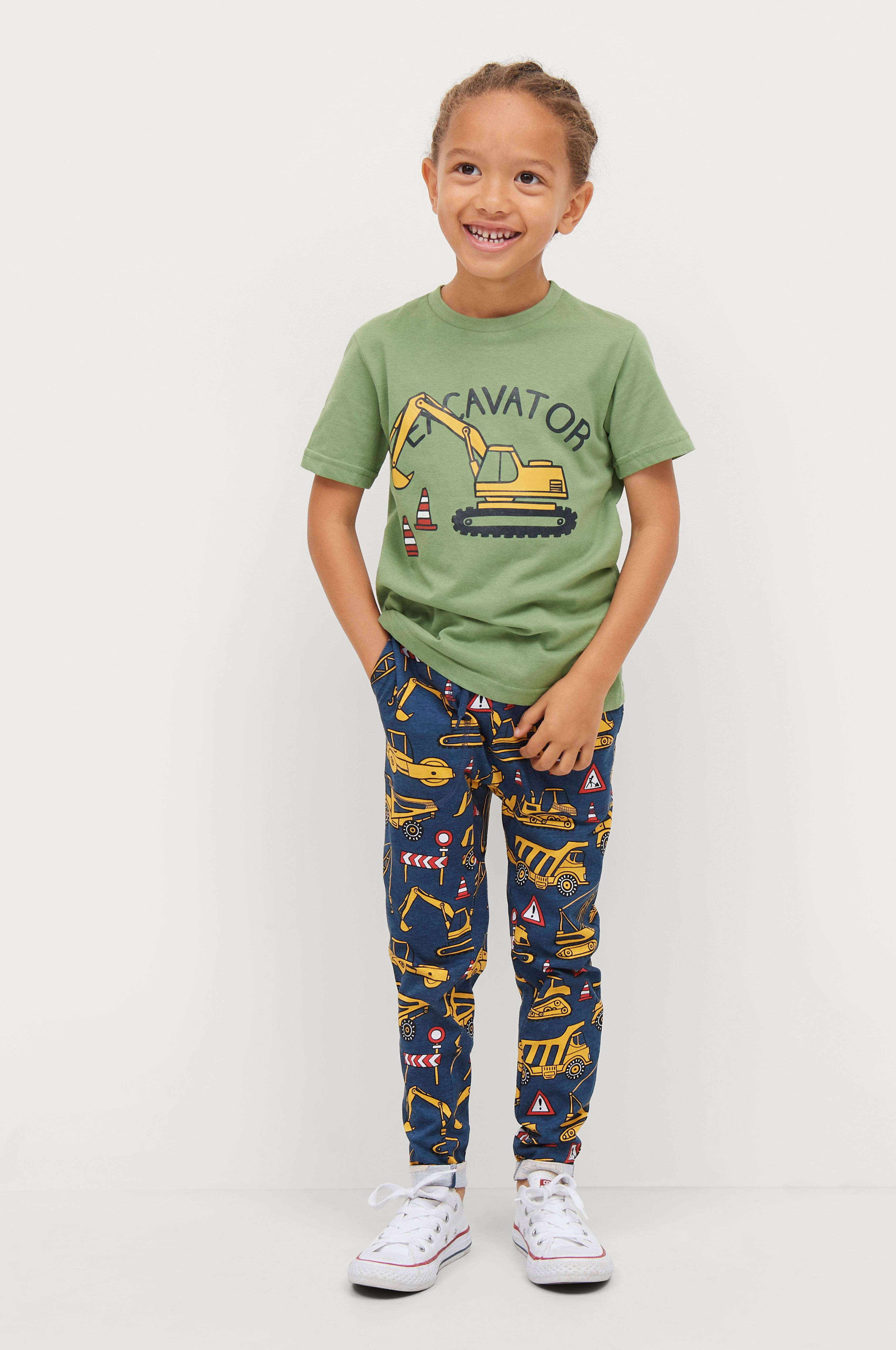 Sæt i blød bomuldsjersey. Kortærmet t-shirt med rund hals og print foran. Bukserne har elastisk talje med løbegang. Syet opslag i benkant.