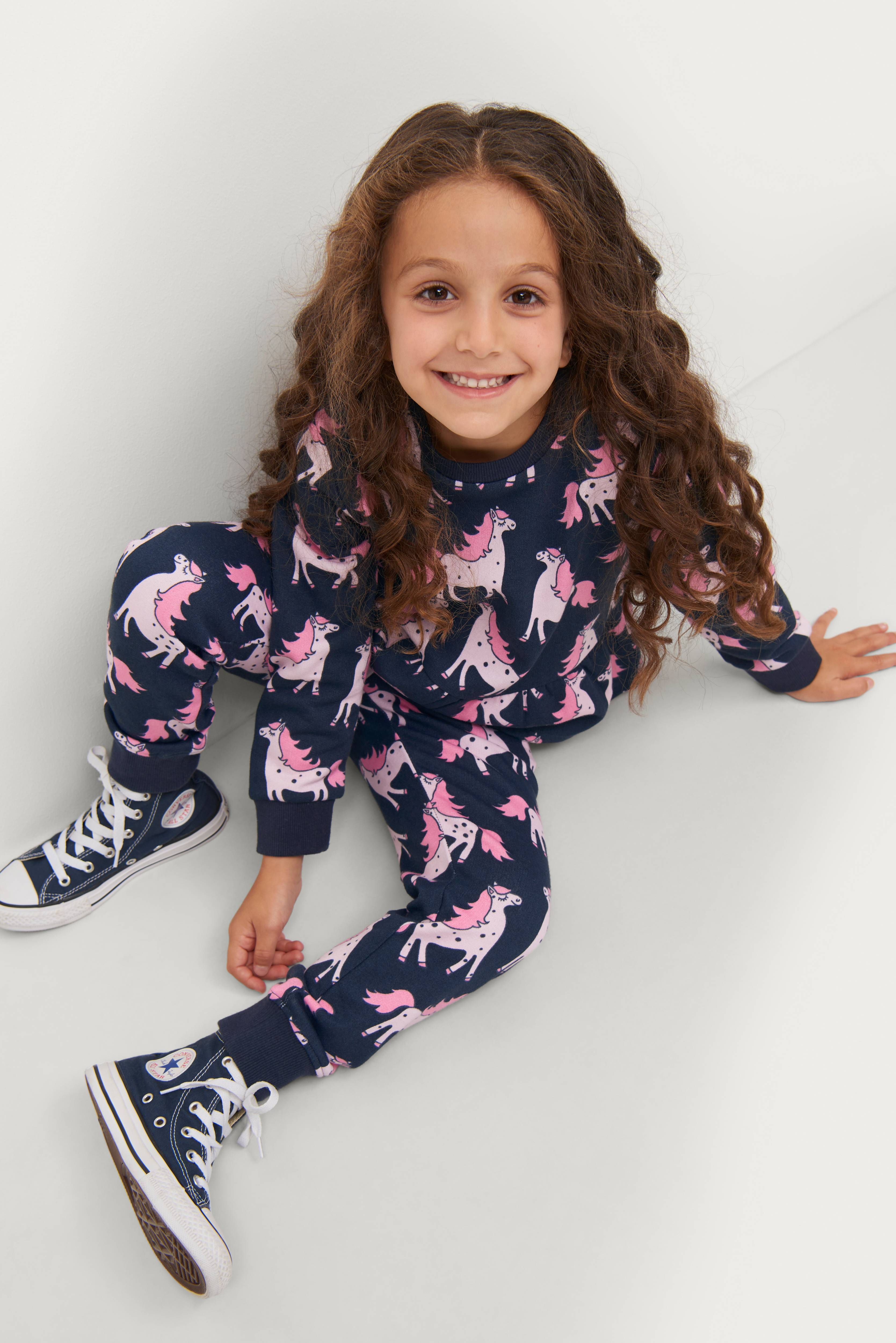 2-delt sæt med sweatshirt og sweatbukser i blød bomuldsjersey. Sweatshirten har blød, børstet inderside og rund halsudskæring. Ribkant i ærmekant og forneden. Bukserne har en elastisk linning i rib med løbegang. To lommer i siderne og ribkant i benkant.