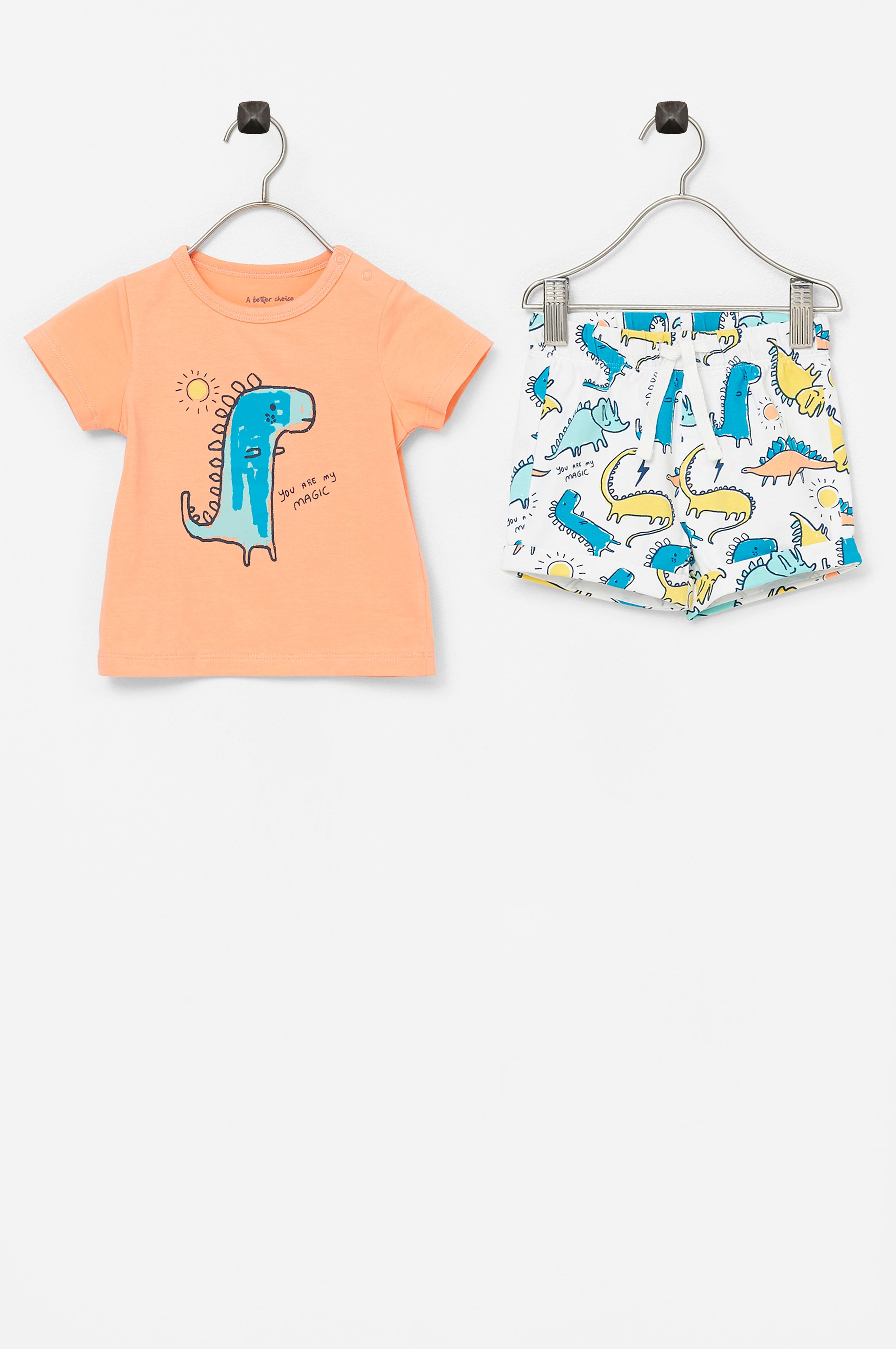 Cleo Set i jersey af økologisk bomuld. Kortærmet T-shirt med trykknapper på den ene skulder. Shorts med elastisk talje med løbegang og opslag i benkant.