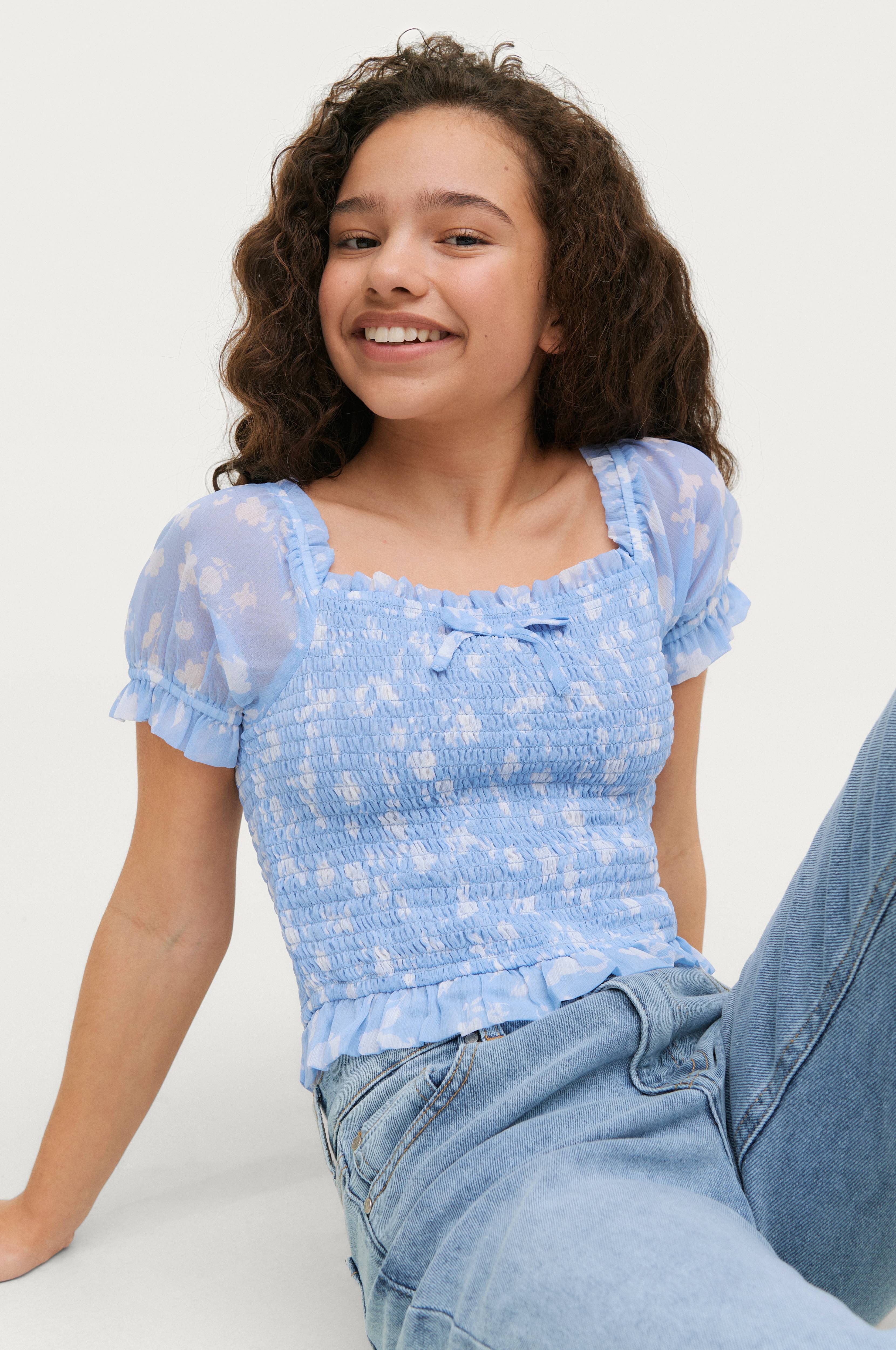 Kort top med elastisk smock. Firkantet halsudskæring med elastik. Korte pufærmer med lille flæsekant. Flæse forneden.