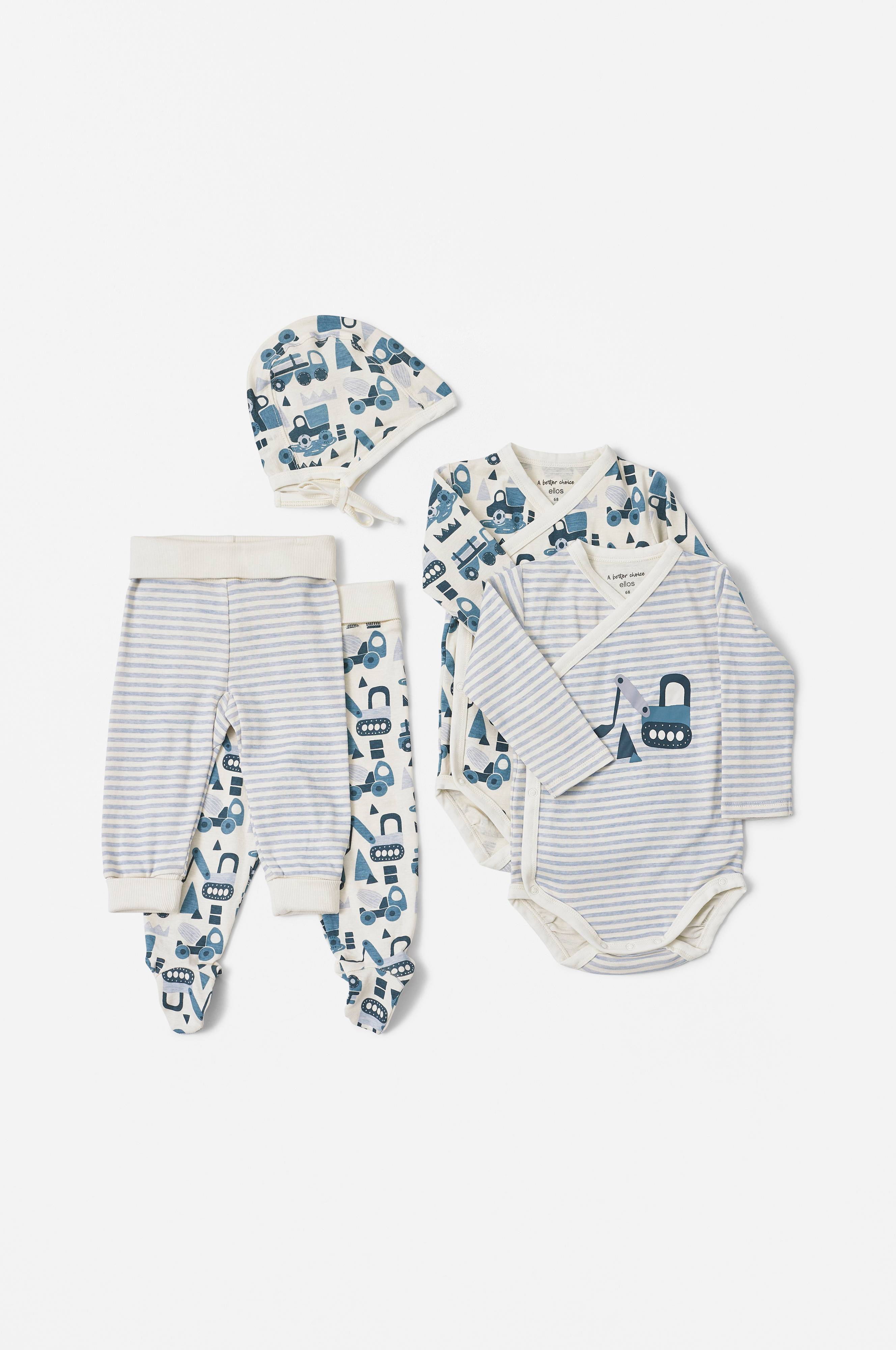 Startpakke eller gavesæt i 5 dele til barnets første tid. Blød jersey af økologisk bomuld.