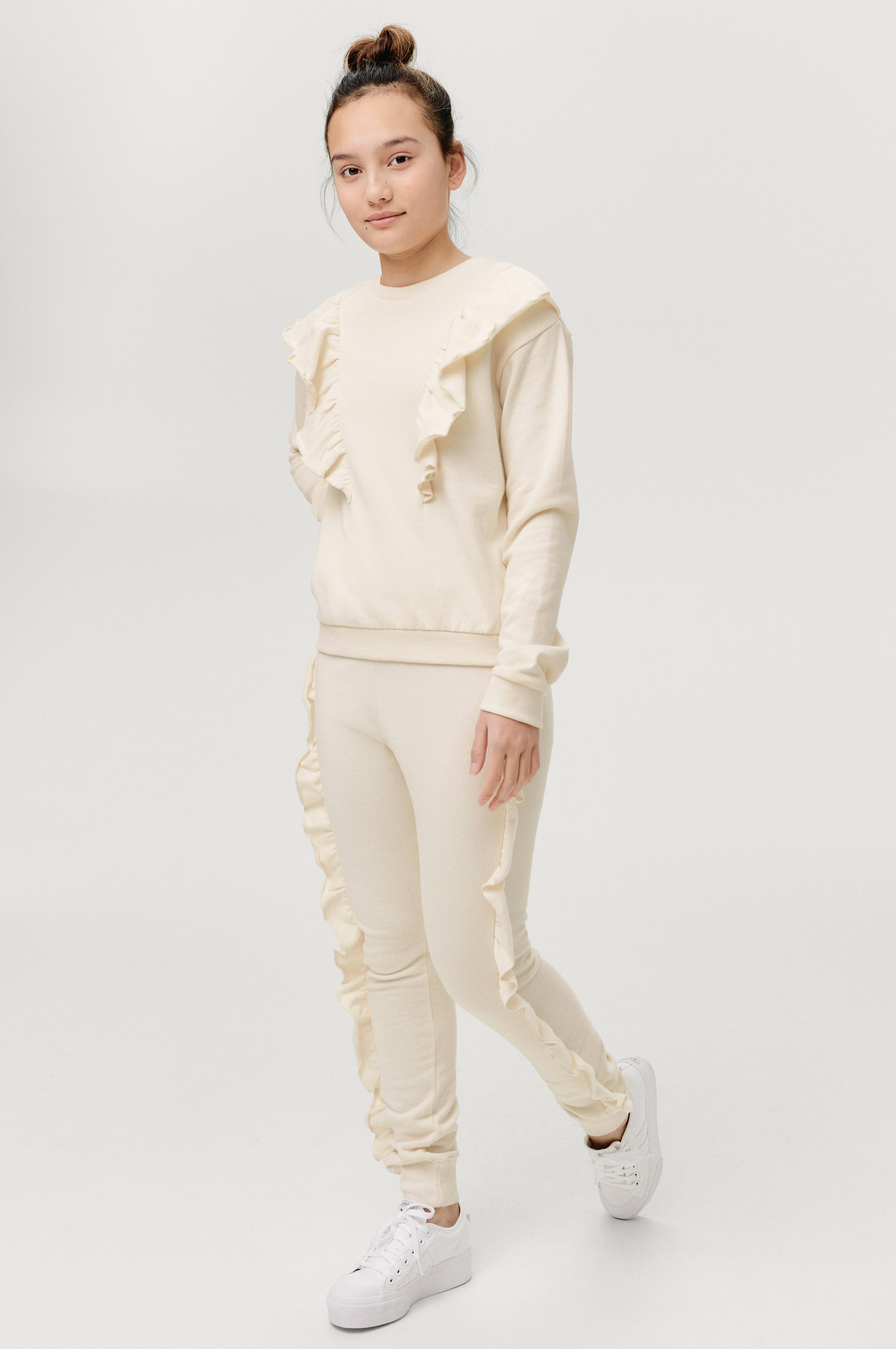 Sweatbukser Lin i bomuld med blød, børstet inderside. Flæser langs benene yderside og ribkant i talje og benkant.