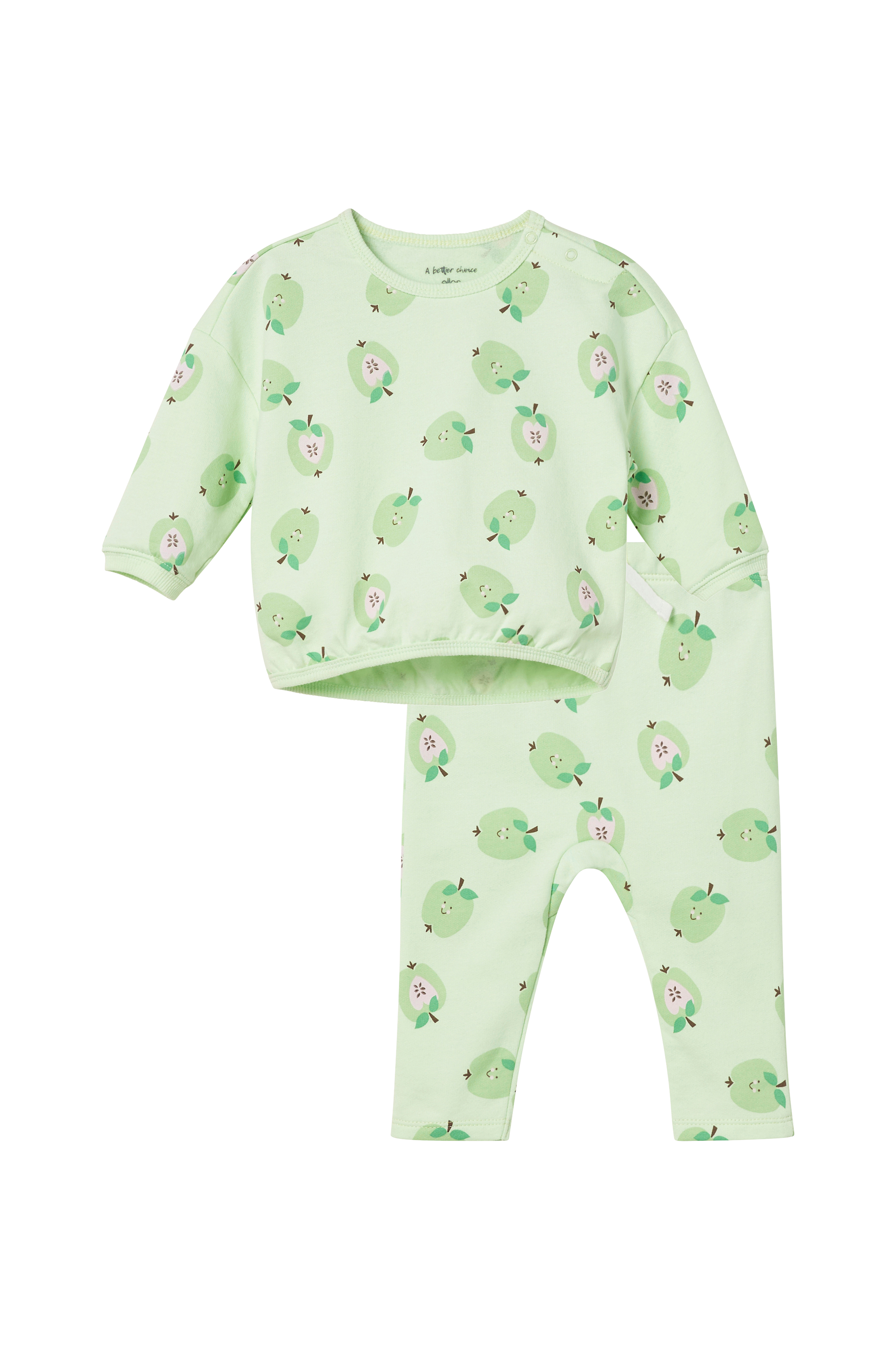 Sæt med trøje og bukser i tynd sweatkvalitet med blødt børstet inderside. Trykknapper på den ene skulder og ribkant i hals, ærmekant og kant forneden. Bukser med løbegang i taljen.