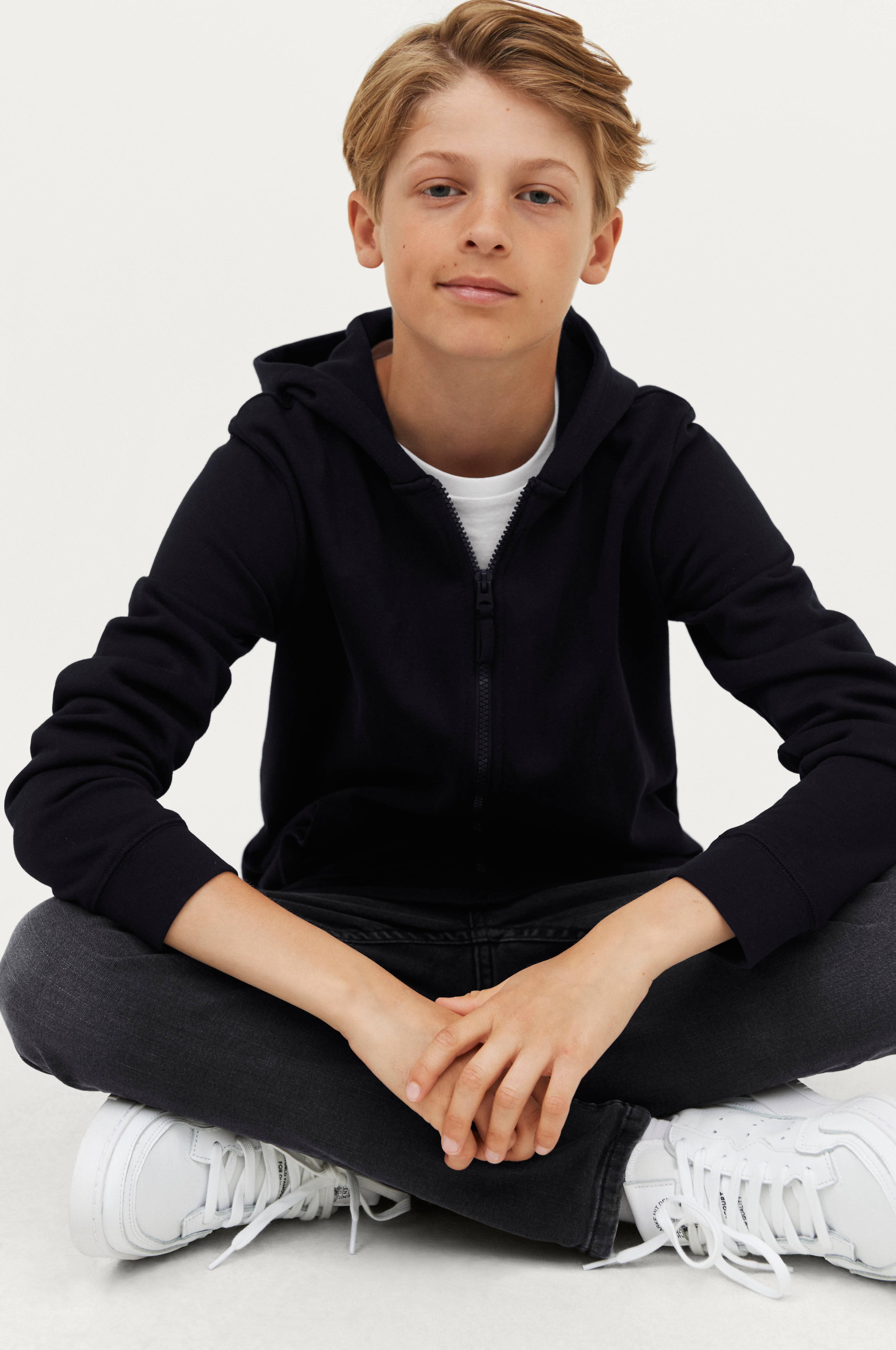 Sweatshirt med jerseyforet hætte og grov lynlås foran. To store lommer på maven og ribkant forneden og i ærmekanterne.