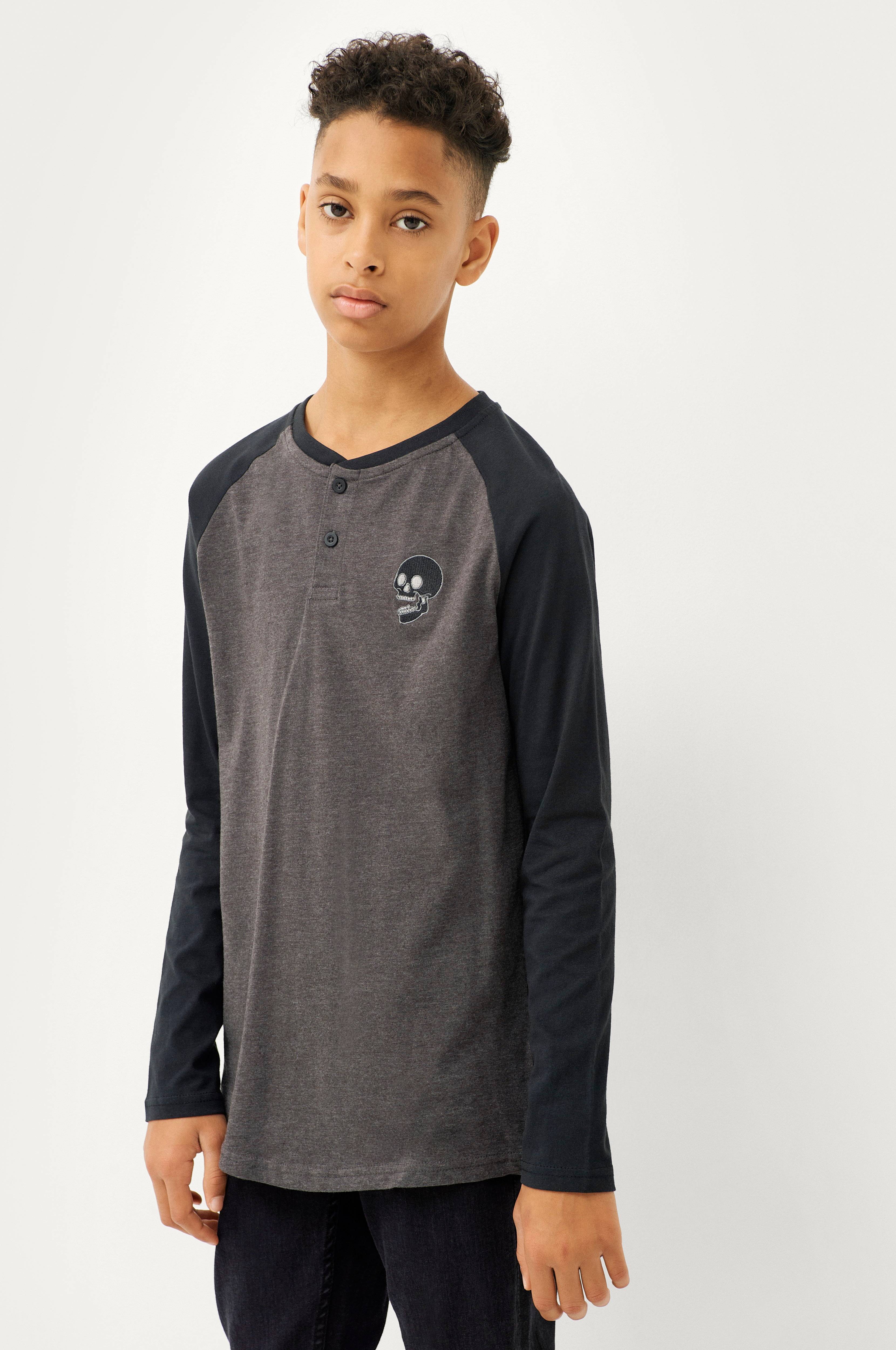 • Rund hals med lille, ribbet kant og en kort knaplukning foran