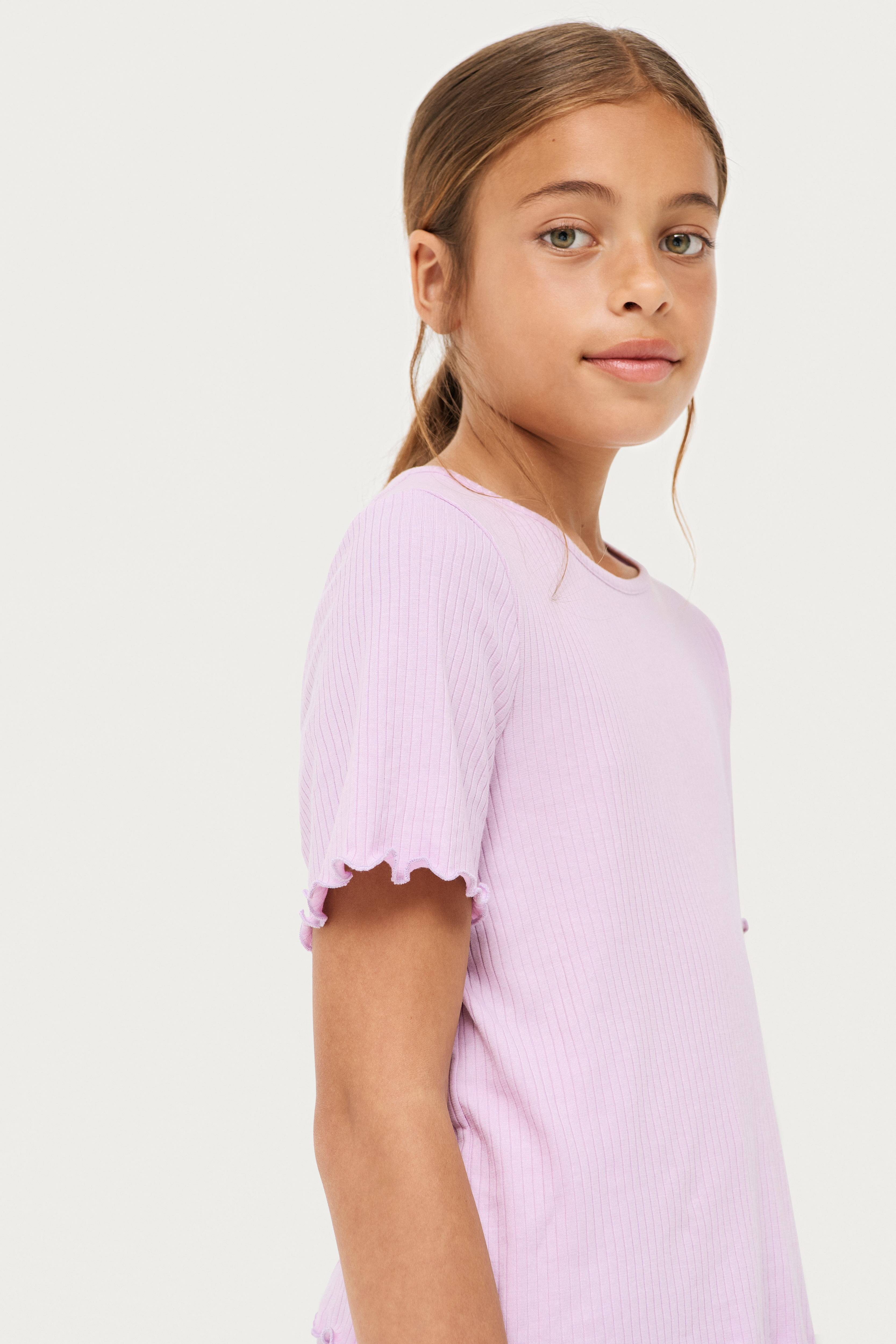 • Kort ærme• Rund hals• Bølget kant ved manchetterne og nederst• Fremstillet af ribbet jersey