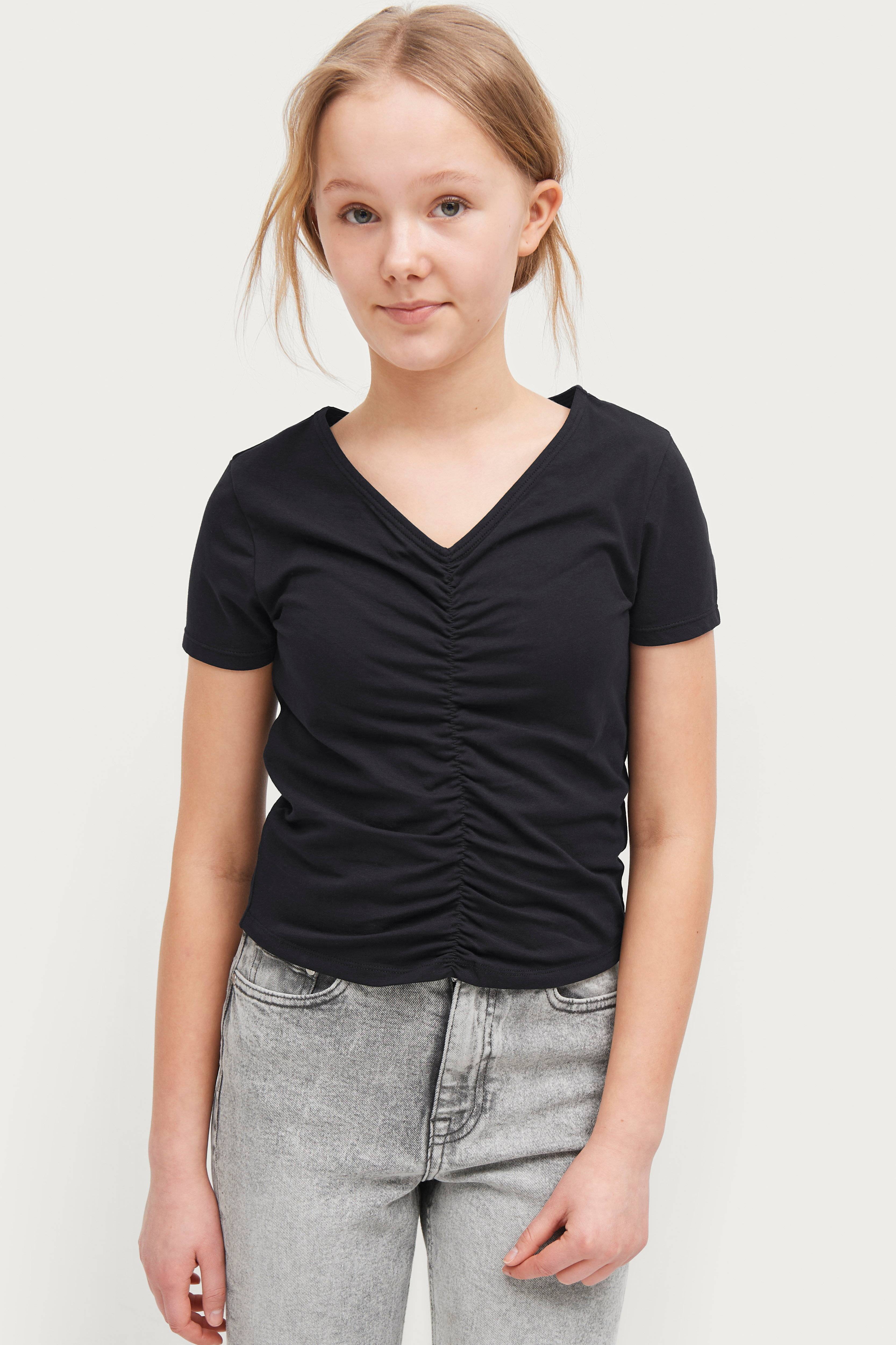Min 8-årige datter kunne godt lide denne model med lidt rynkning foran. Fint bomuldsmateriale.
