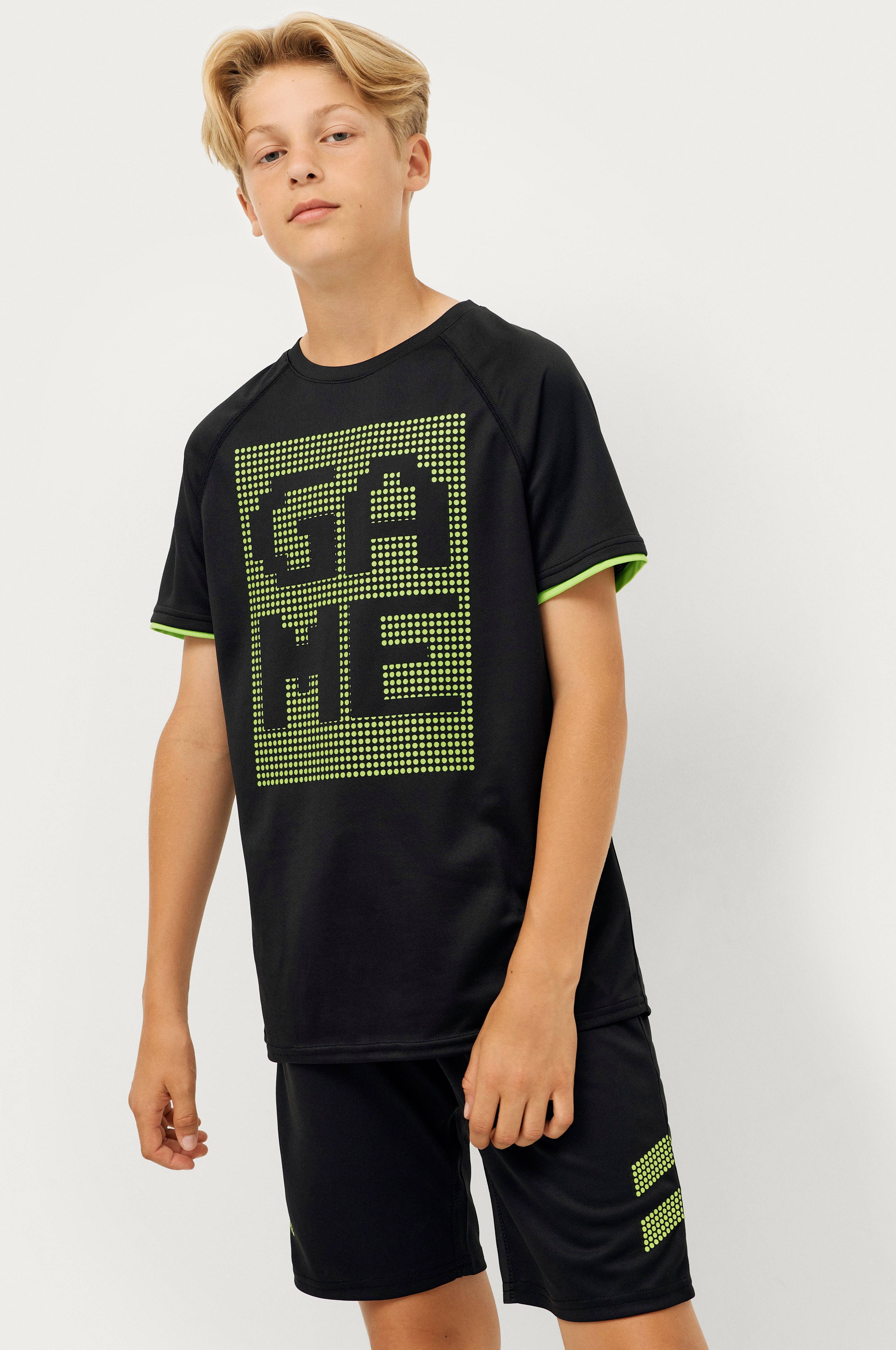 2-delt træningssæt i hurtigtørrende materiale. Kortærmet T-shirt med print på ærmerne og på brystet. Shorts med løbegang i taljen og print på det ene ben.