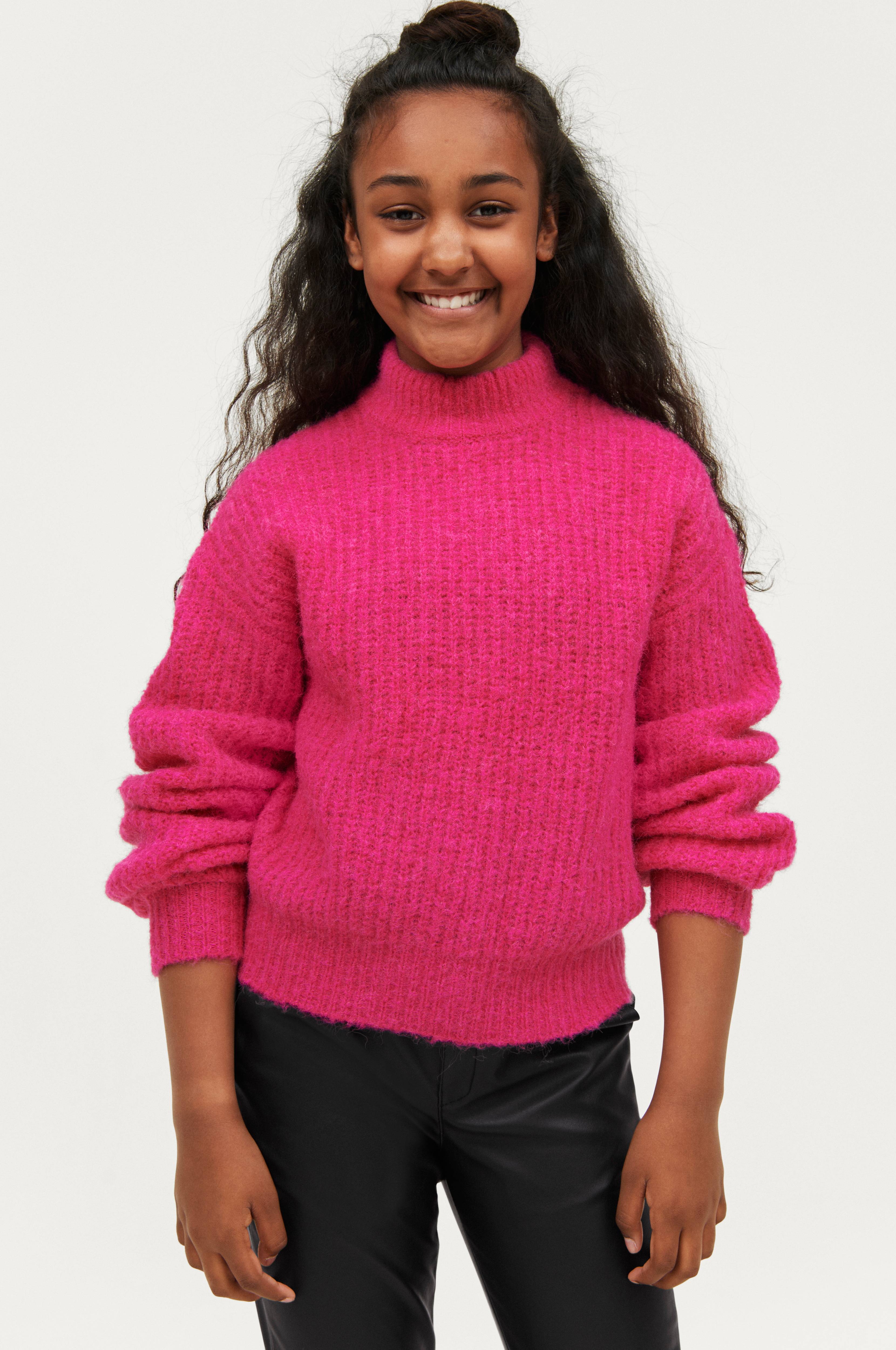 Trøje i blød, groftstrikket kvalitet. Høj hals og ekstra lange ærmer med ribstrikket kant.
