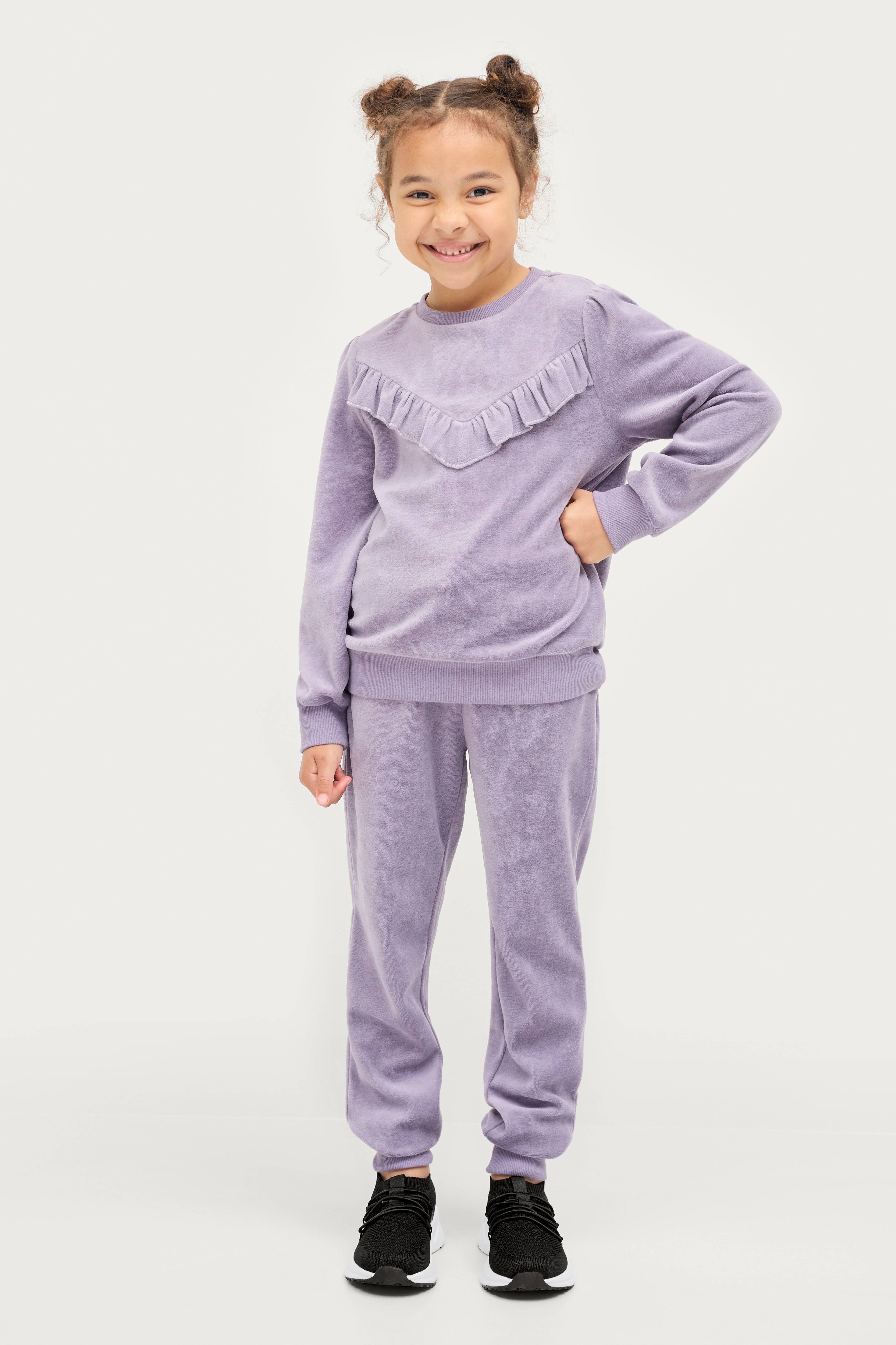 • Top med langt ærme og volant på brystet• Rund hals• Ballonærme• Ribmanchet ved manchetterne og nederst• Bukser med manchet ved enden af benene• Linning med elastisk bånd og træksnørre• Lommer foran