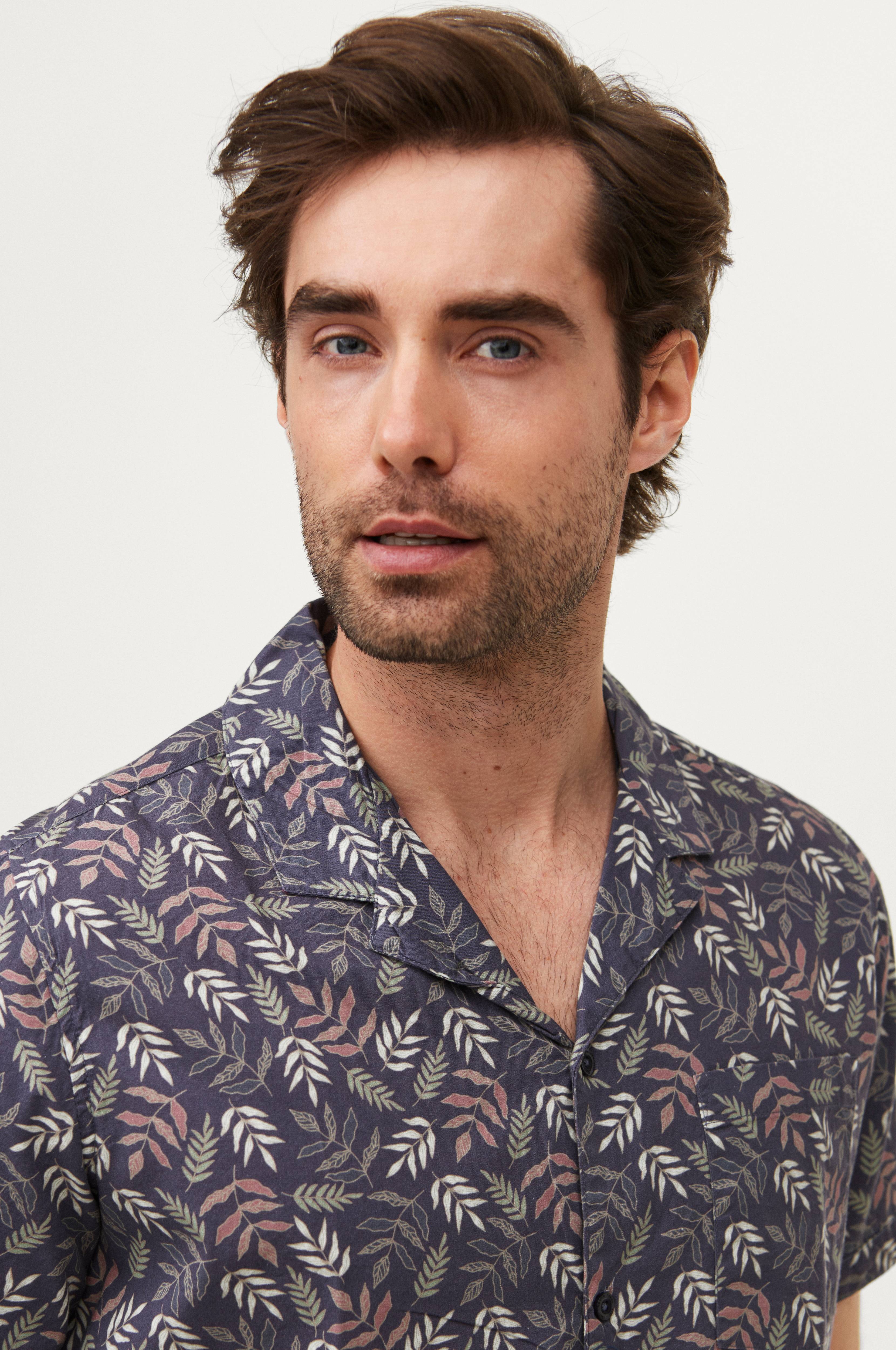 Kortærmet skjorte i bomuld med resortkrave og printet mønster. En påsyet brystlomme. Noget længere bagpå.