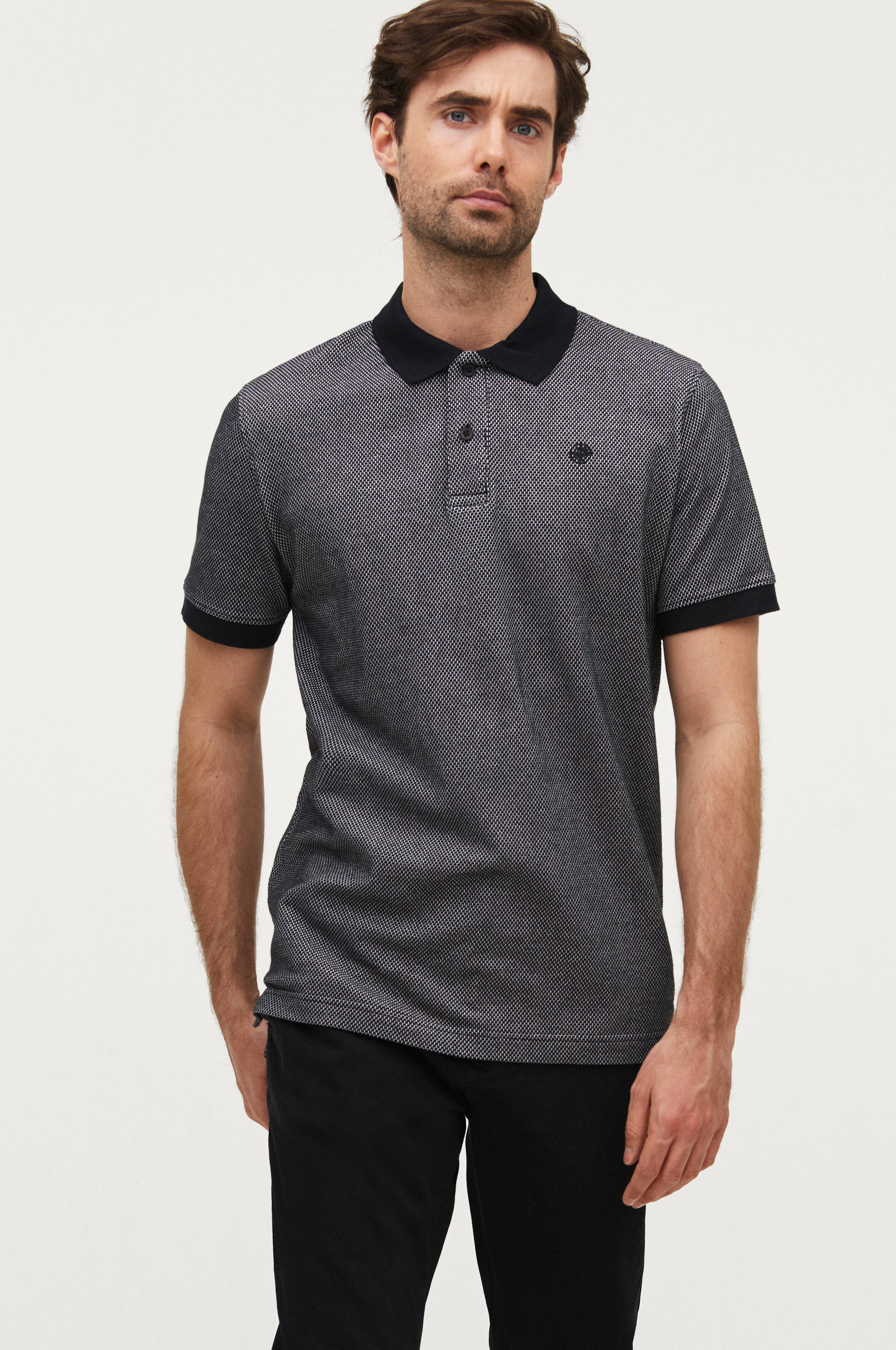 T-shirt med let struktur. Ribkrave og stolpelukning med tre knapper. Ribkanter i ærmerne og lille broderi på brystet. Slids i siderne og noget længere bagpå.