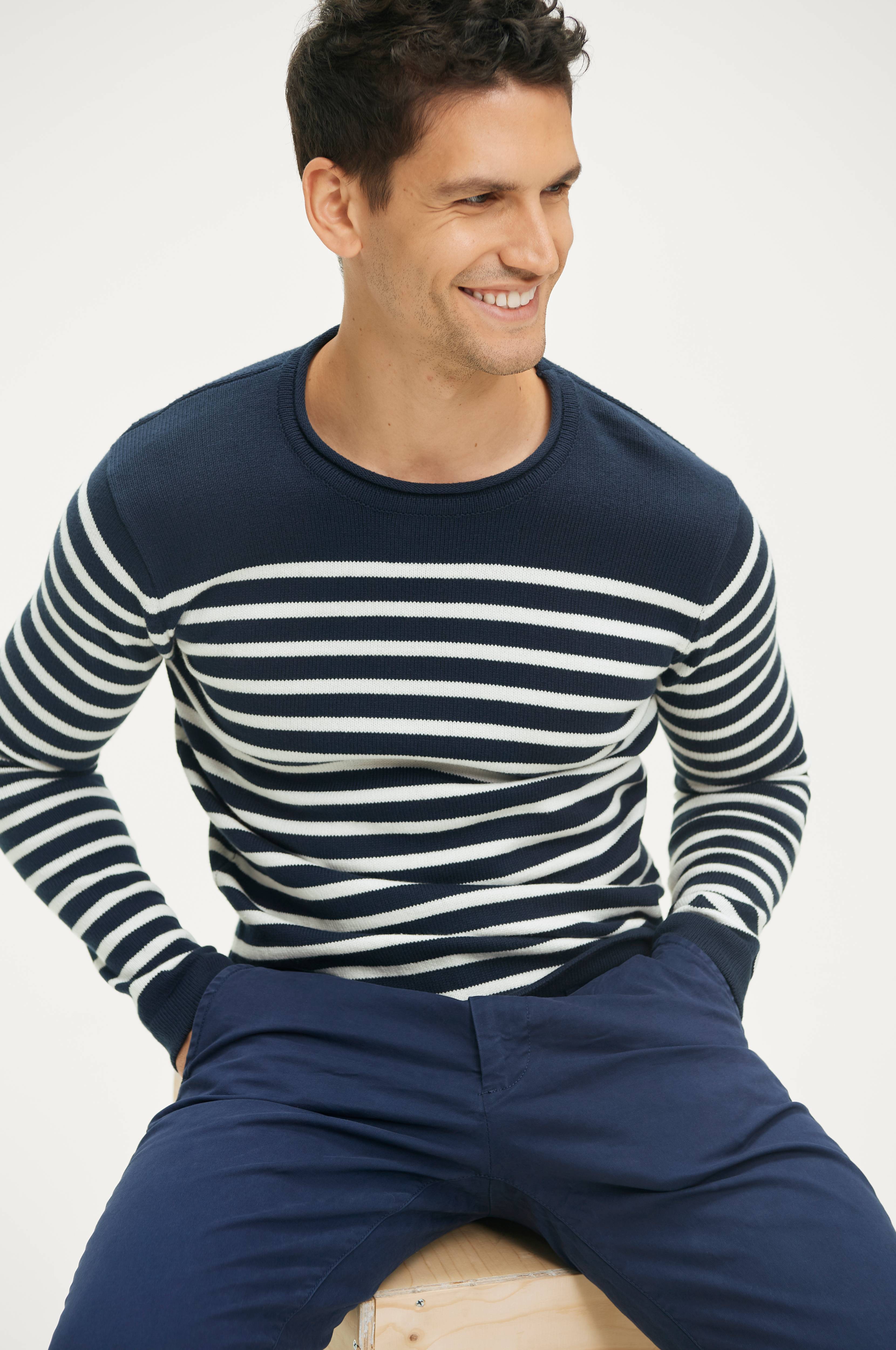 Trøje Archer fra On Our Terms. Stribestrikket model med dobbelt kant forneden og i ærmekant samt rund hals med ribstrikket rullekant. Længde ca. 70 cm i str. M.