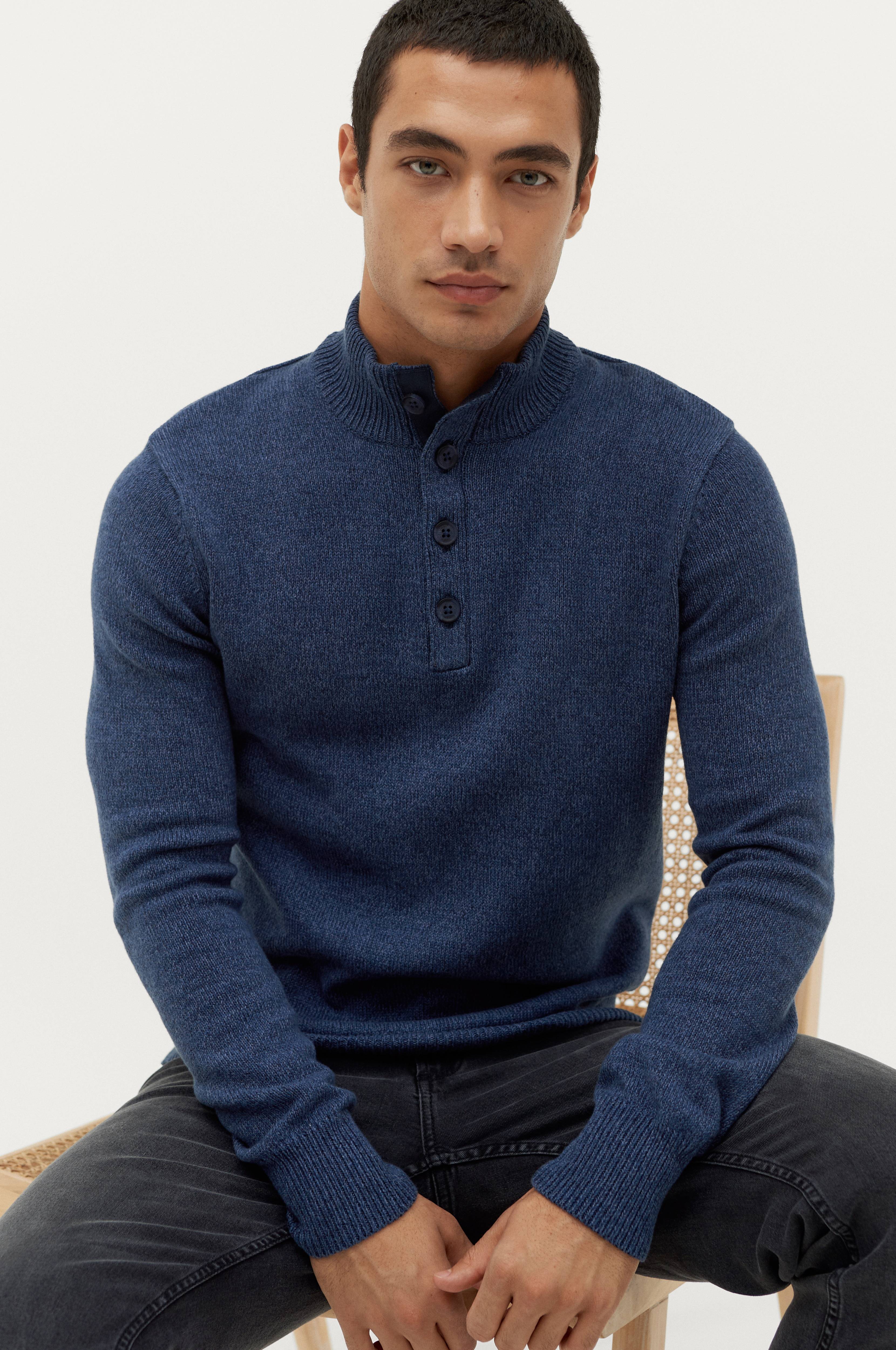 Trøje i lige model med høj, ribstrikket krave og kort stolpelukning. Rib i kanten forneden og ærmekanten. Længde ca. 74 cm i str. M.