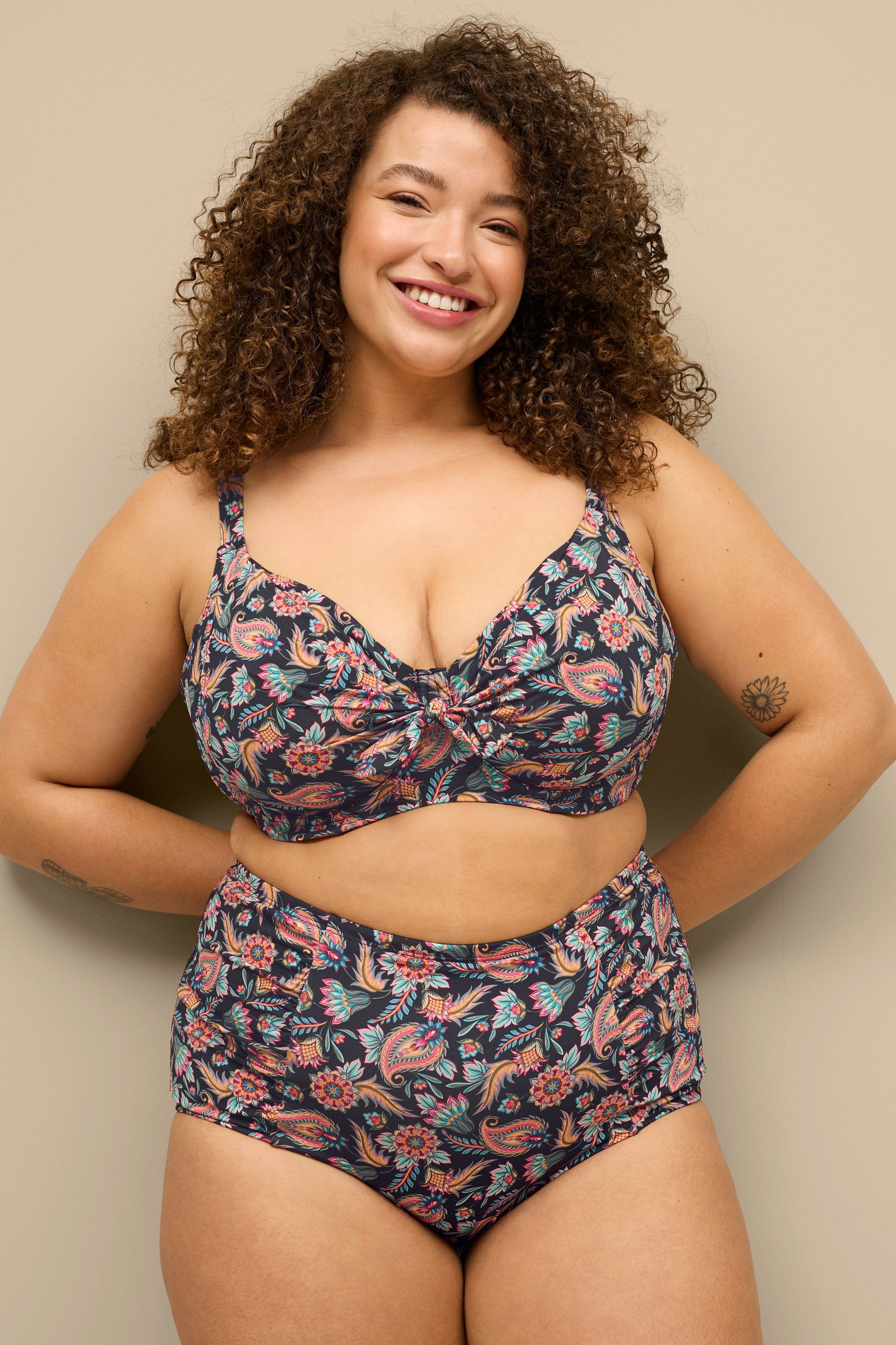 Bikinitrusse i maximodel med høj talje og brede sider med rynkning foran. Smal elastik i talje og benåbning. Foret i mesh foran og i jersey bagpå.