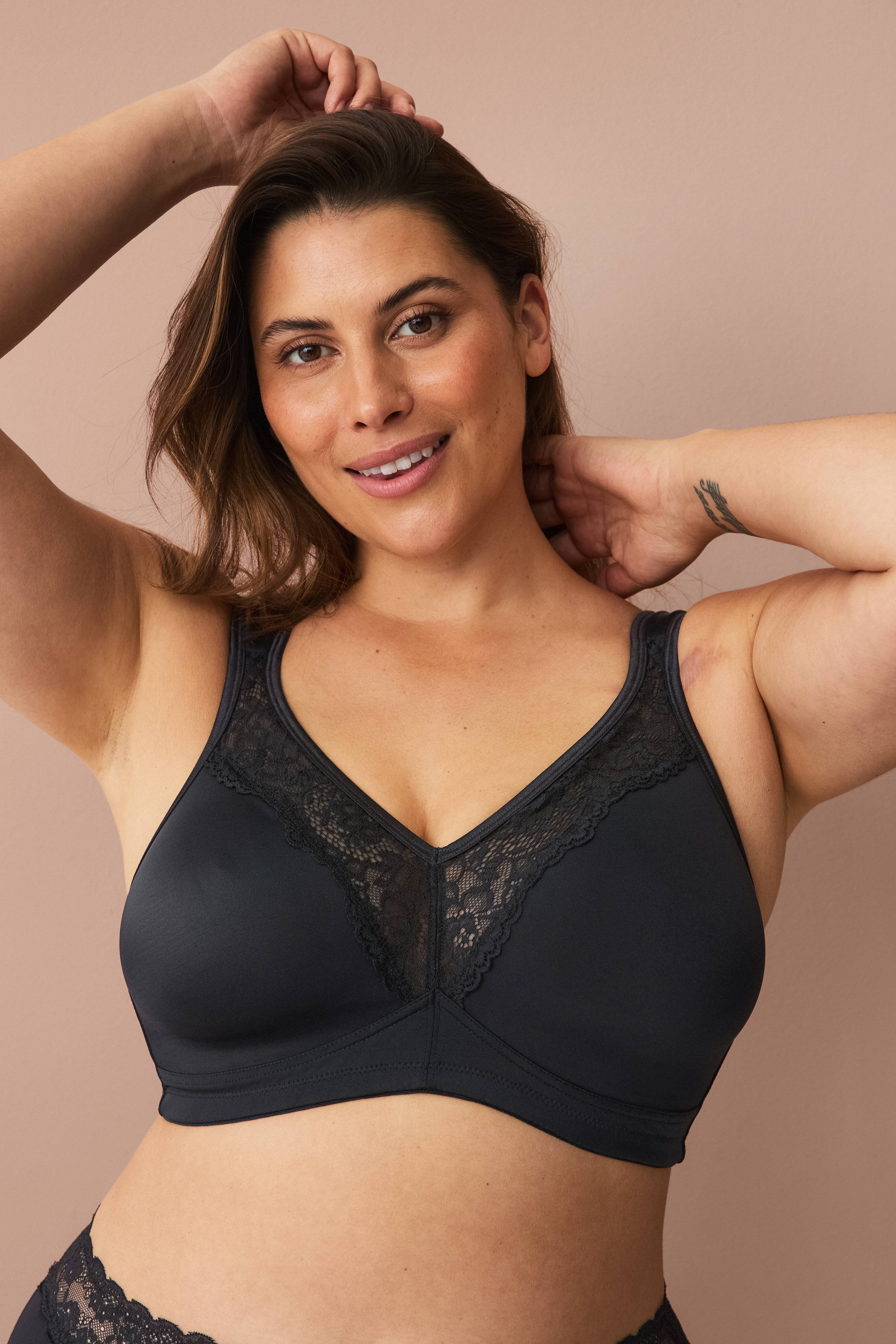 • Rygløs bh i fleksibel jersey. Tynde, formstøbte skåle med blonder foroven. Elastisk bund for støtte. Justerbare skulderstropper med polstring foran for komfort. Bred hægtelukning bagpå.
