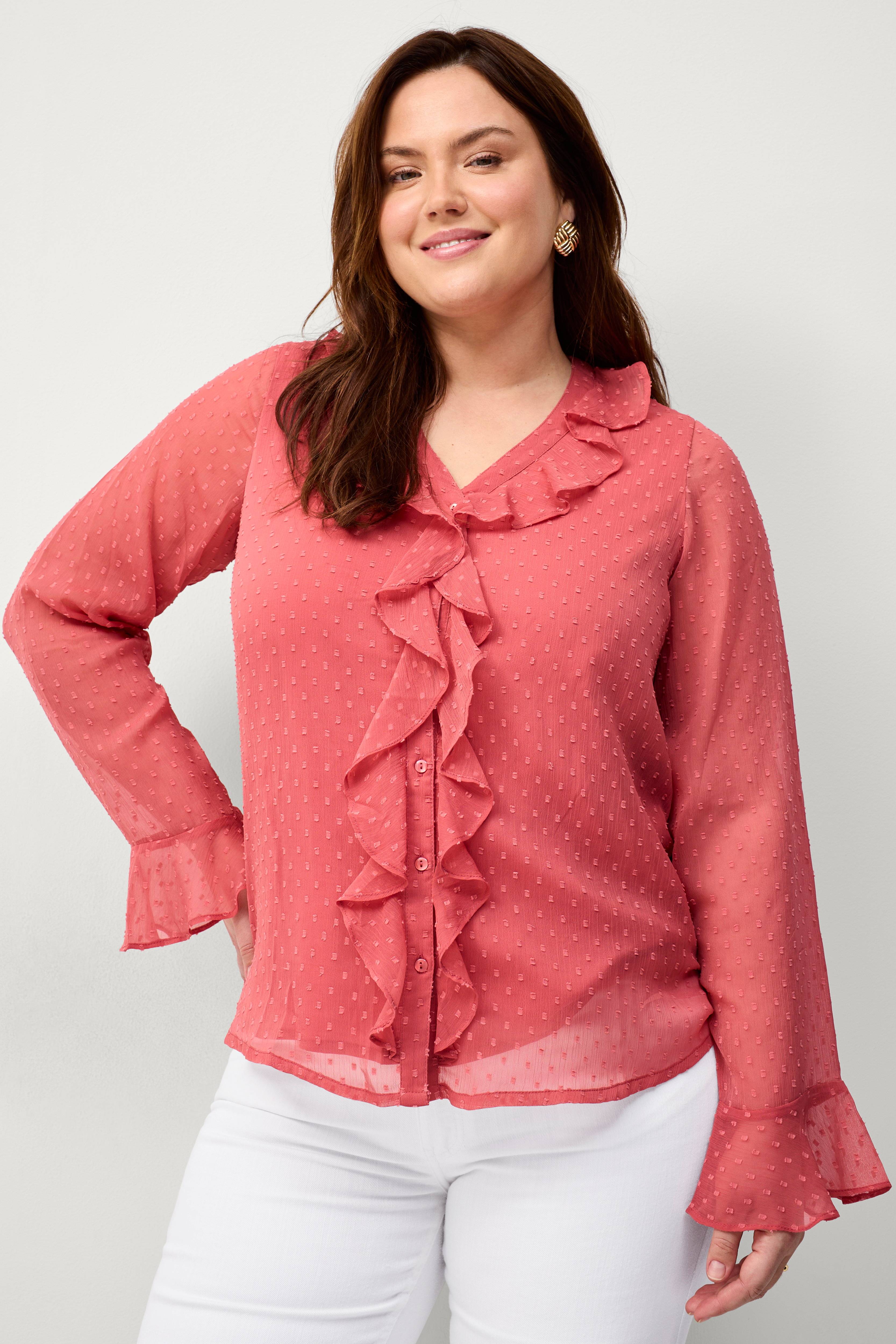 • Bluse i chiffon med strukturmønster • Knapper foran • V-udskæring med volant • Transparente ærmer med volant ved manchetterne • Vævet for • Længde: 68 cm i størrelse 42/44