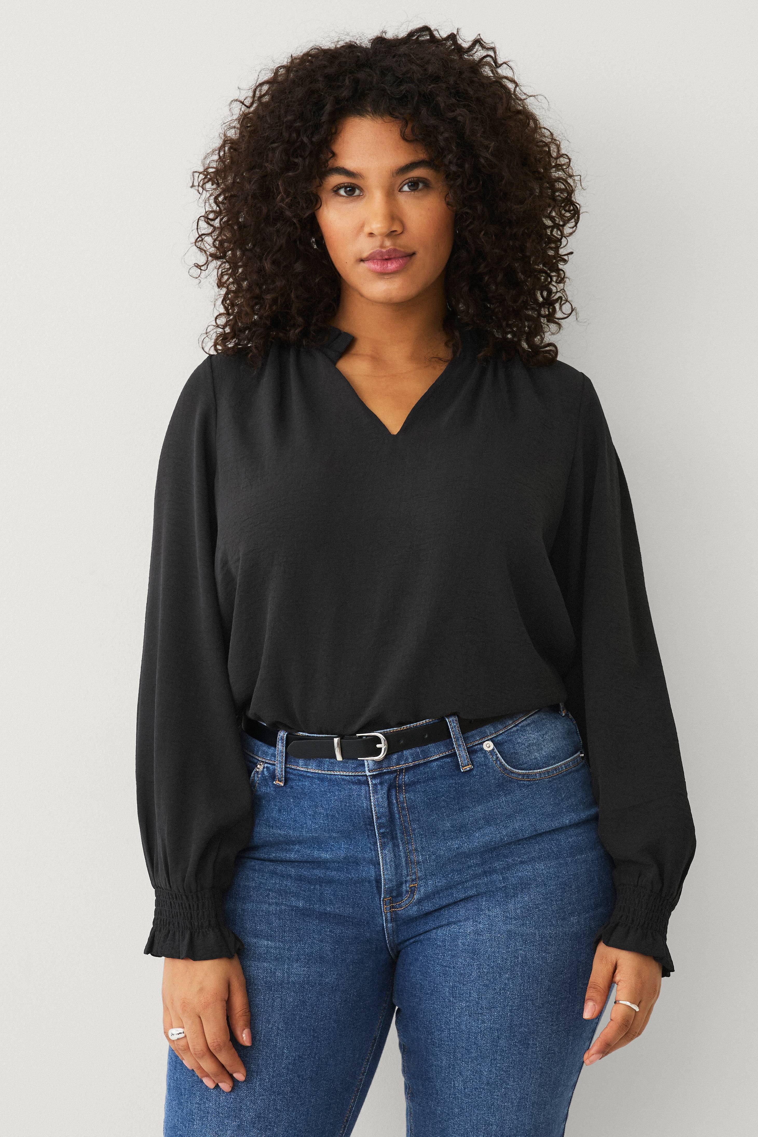 • Bluse i tyndt, luftigt materiale• V-formet halsudskæring med plisseret design• Lange arme med smock ved manchetterne• Stor størrelse• Længde: 74 cm i størrelse XL