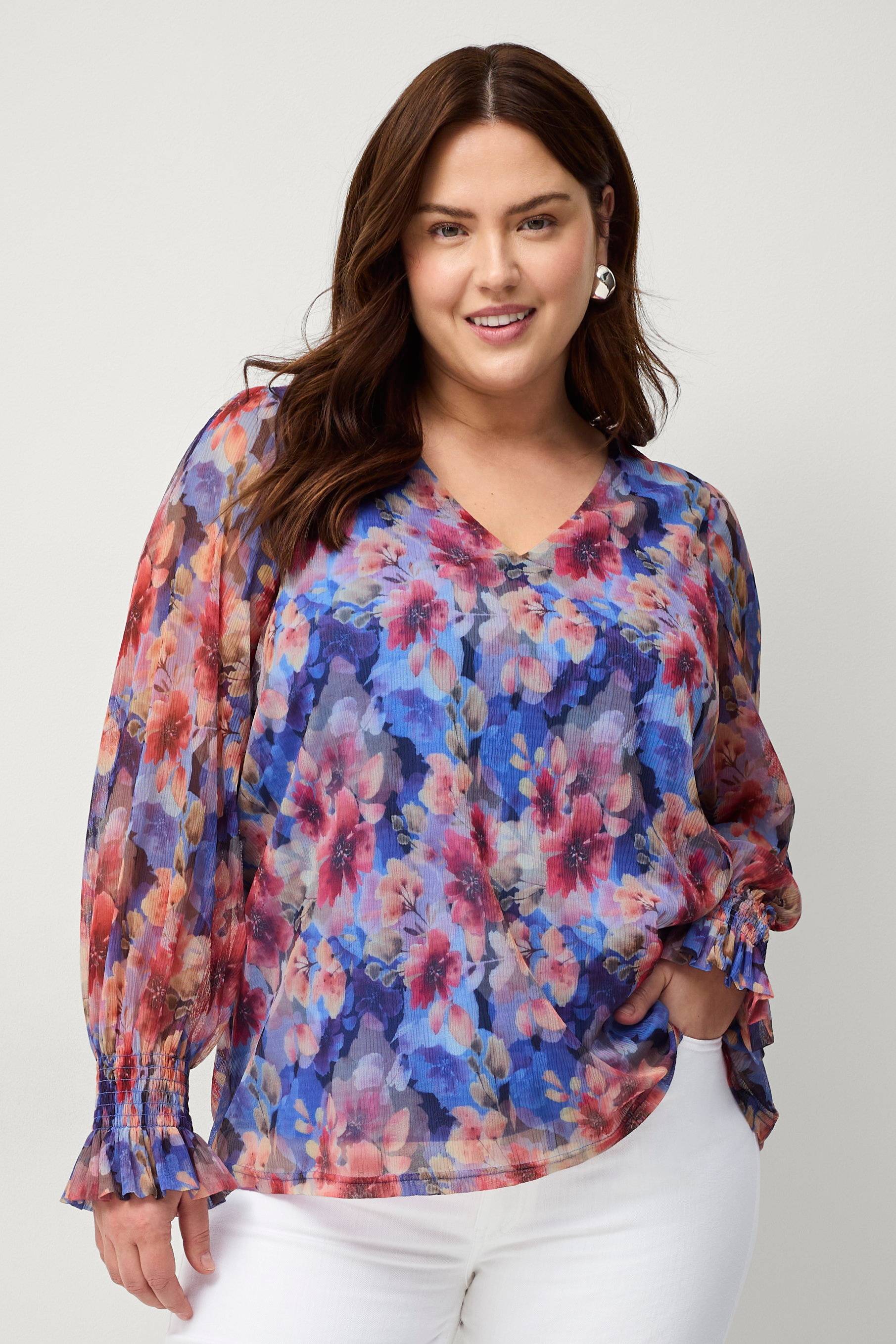 • Bluse i rynket meshtrikot • V-udskæring • Transparente ballonærmer med smock og volant ved manchetterne • Trikotfor • Længde: 72 cm i størrelse 42/44