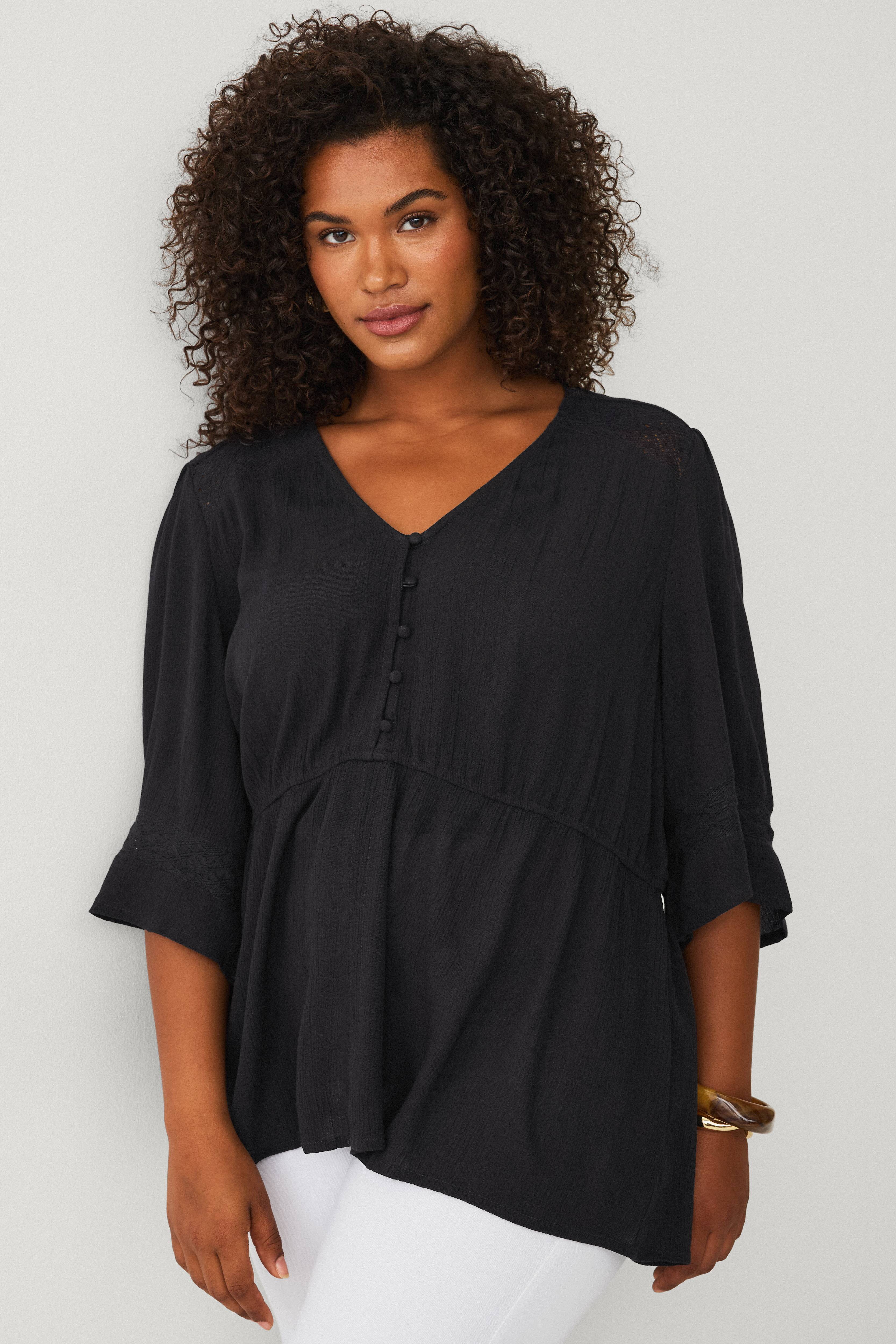 • Model med svaj i crepe • V-formet halsudskæring • Blondeindlæg på skuldrene og på ærmerne • Kort knaplukning foran med beklædte knapper • Halvlangt ærme med svaj • Defineret talje med indlagt elastik • Længde: 74 cm i størrelse XL