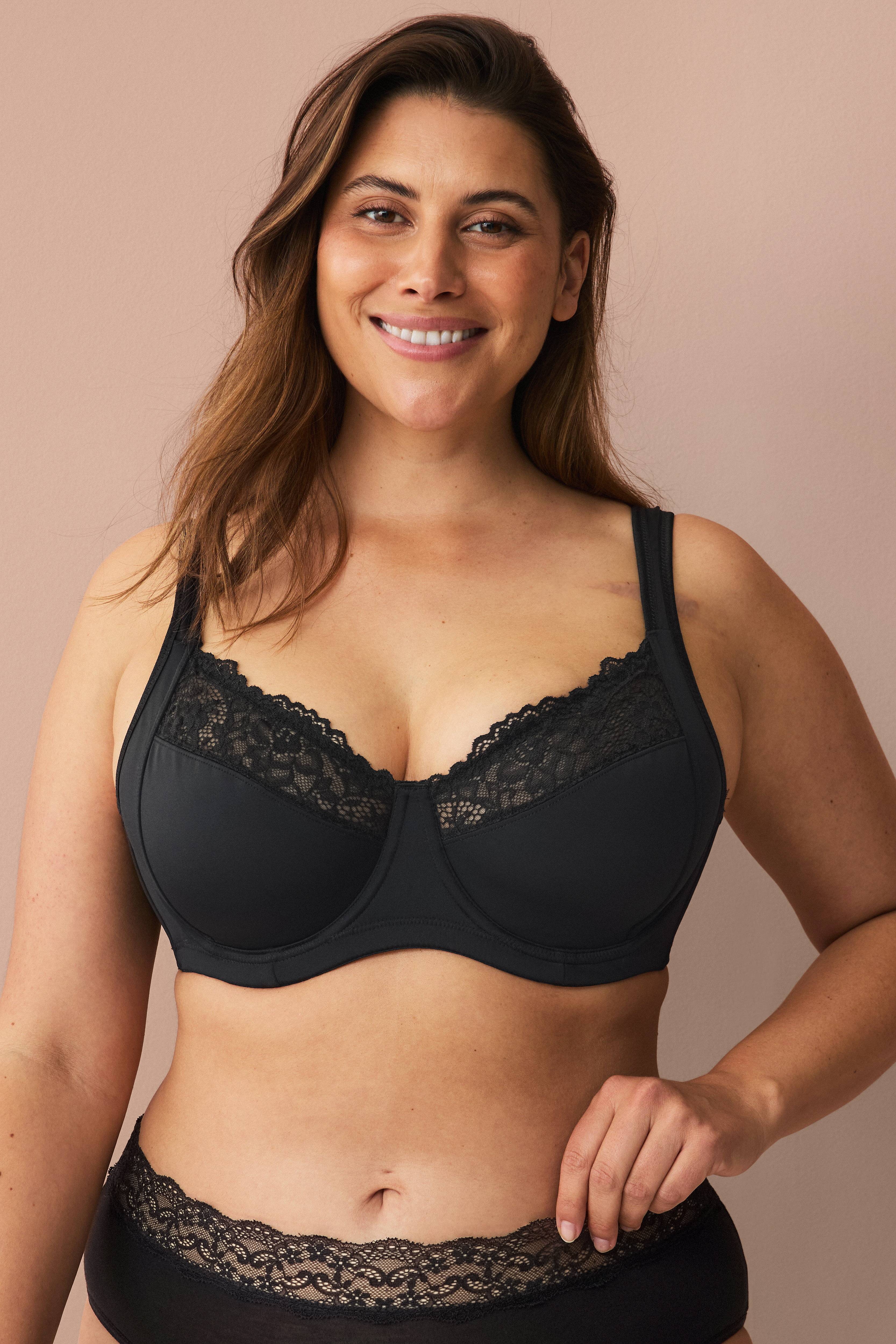 • Bøjle-bh med bløde, upolstrede skåle med blonder foroven. Brede, vatterede skulderstropper og brede bagskåle med blødt for.