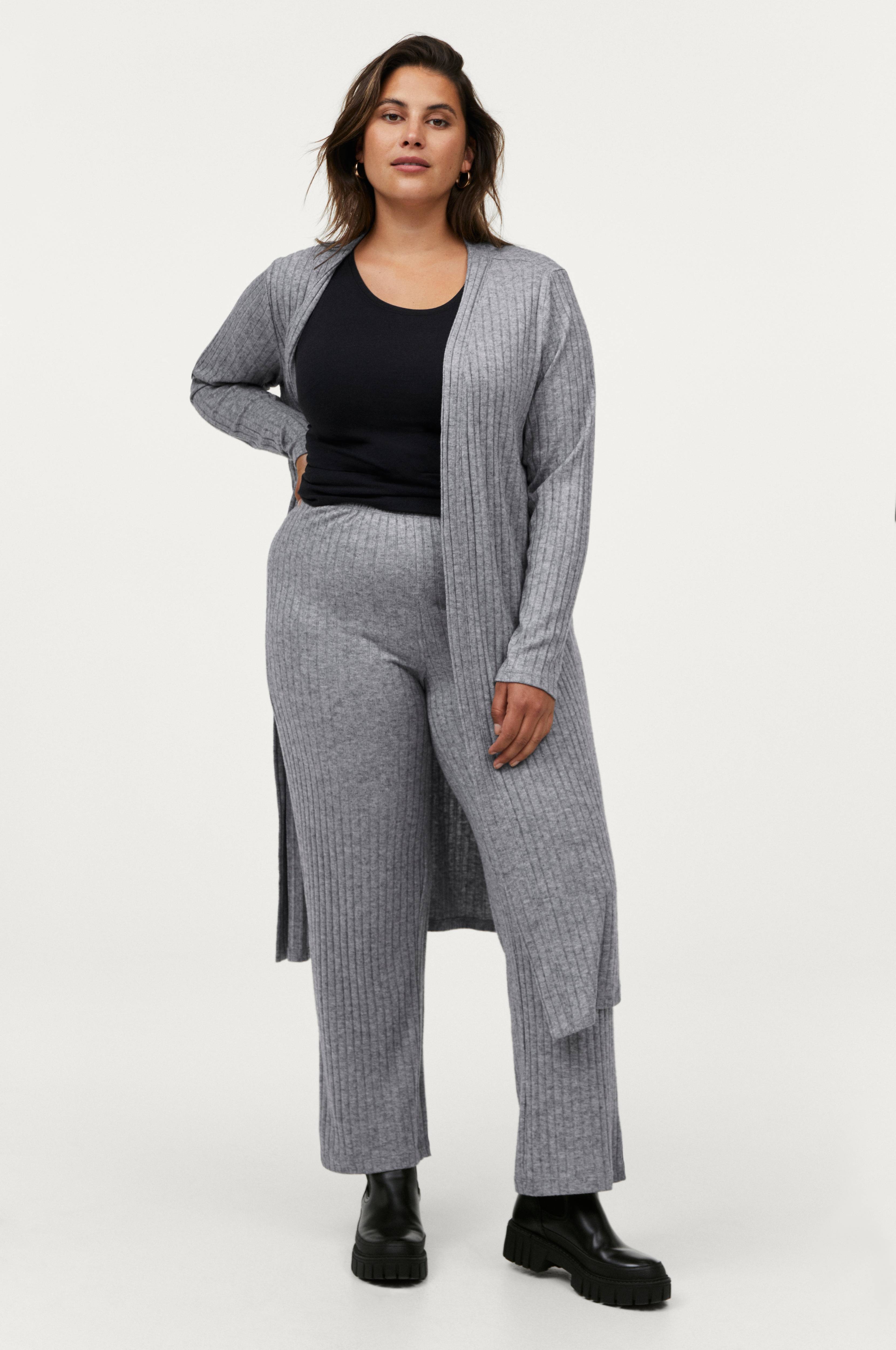 • Tynd, ribbet jersey med strikket følelse• Løs pasform• Brede ben• Elastisk talje