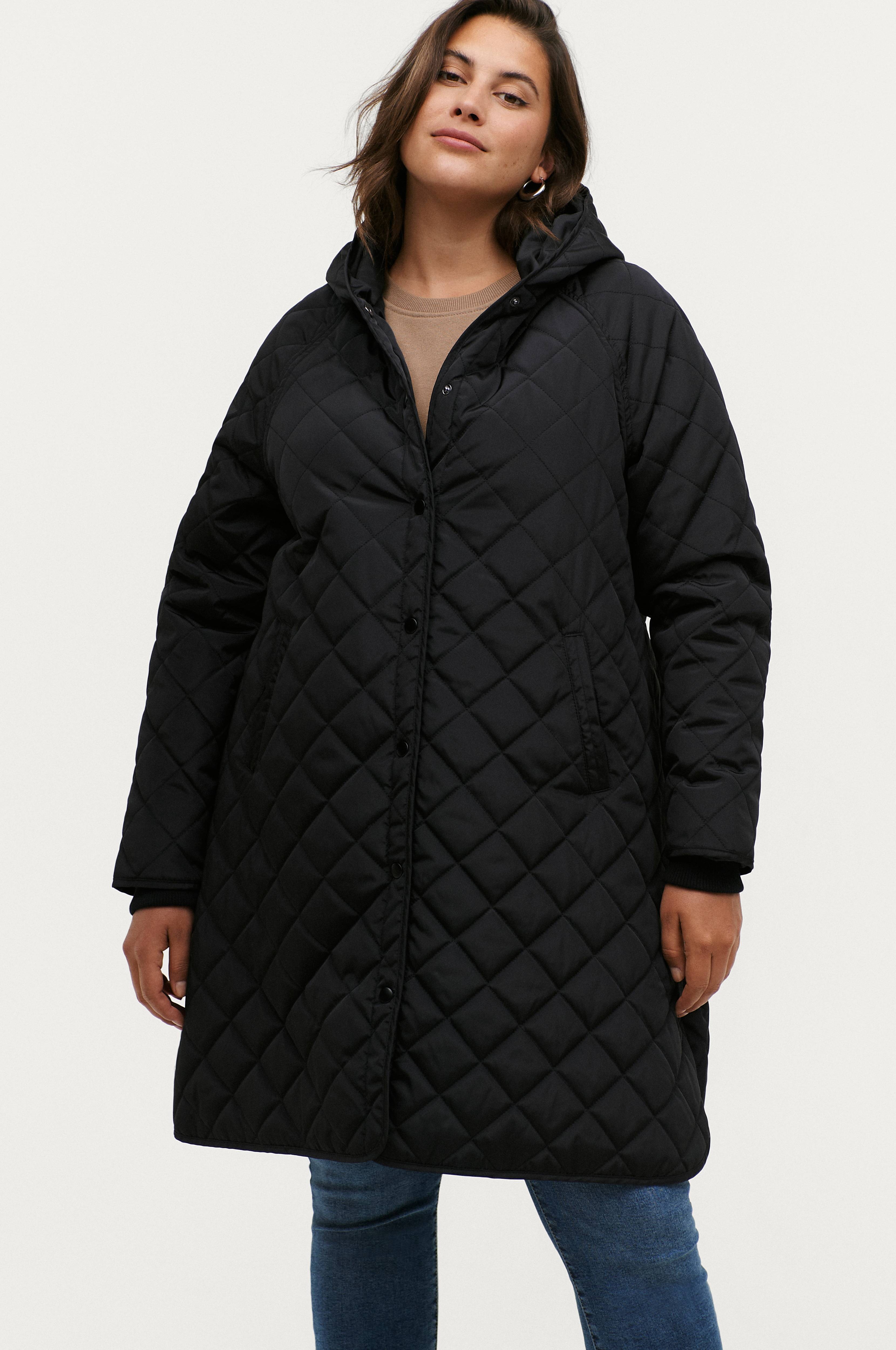 Quiltet jakke med tynd vattering. A-formet model med trykknapper og lommer foran. Fast hætte og skjult ribkant i ærmekanten. Sideslids forneden. Længde ca. 97 cm i str. 42/44.