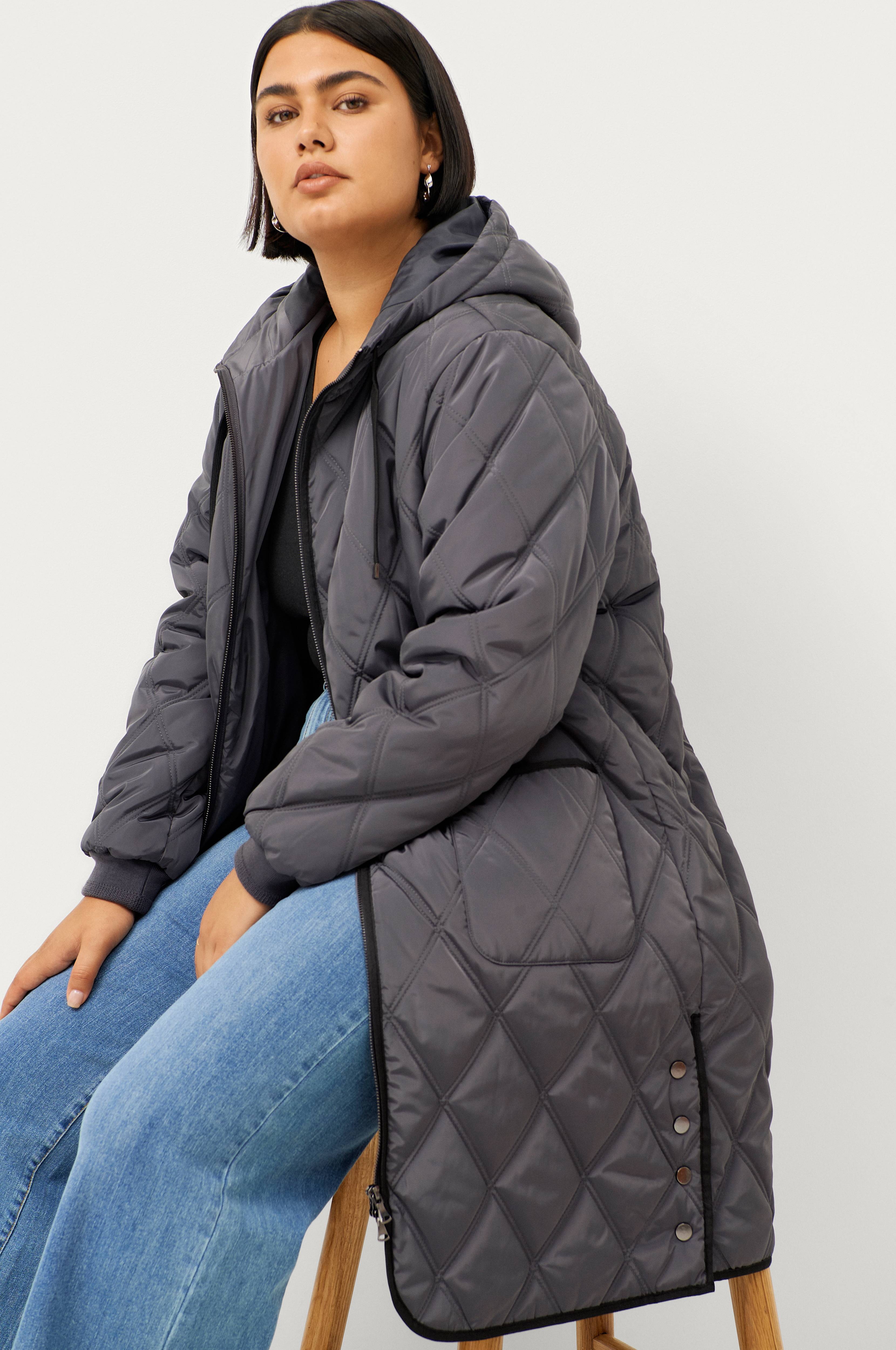 Quiltet og vatteret jakke med let blankt yderstof. Glat, vævet for. Fast hætte med løbegang. Lukning med 2-vejslynlås og to udvendige lommer. Ribkanter i ærmekant og slids i siderne med trykknapper. Længde ca. 100 cm i str. 42/44.