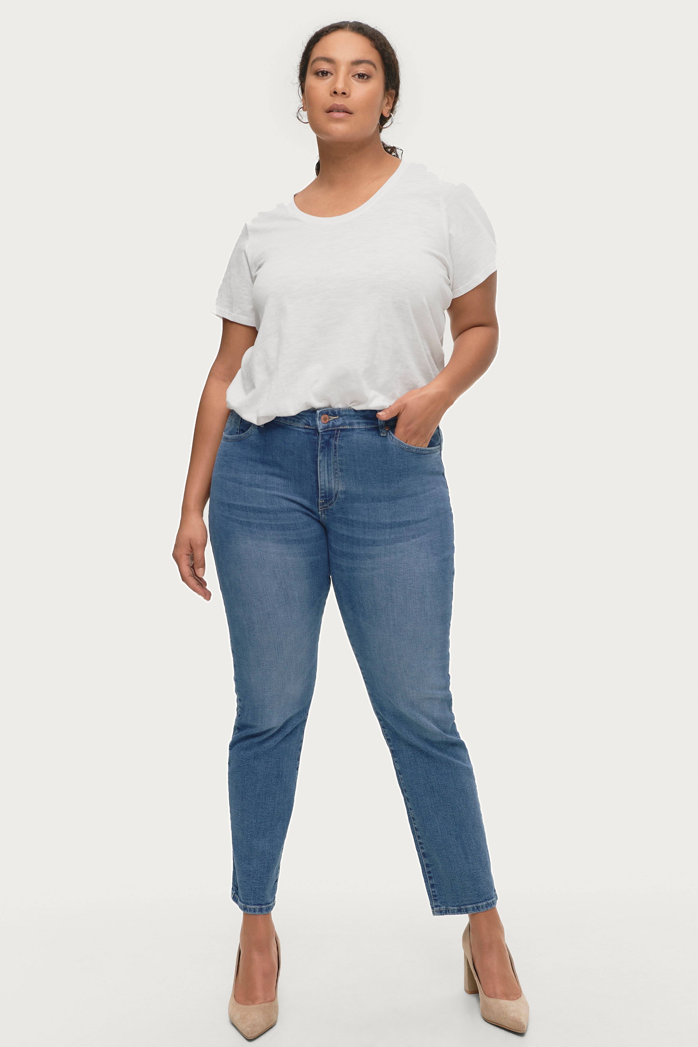 Jeans Lex Straight. Model i fin stretchdenim med lige ben og lige benkanter. Tre forlommer og høj talje med lynlås i gylpen samt to påsyede baglommer. Benlængde ca. 76 cm i alle størrelser.
