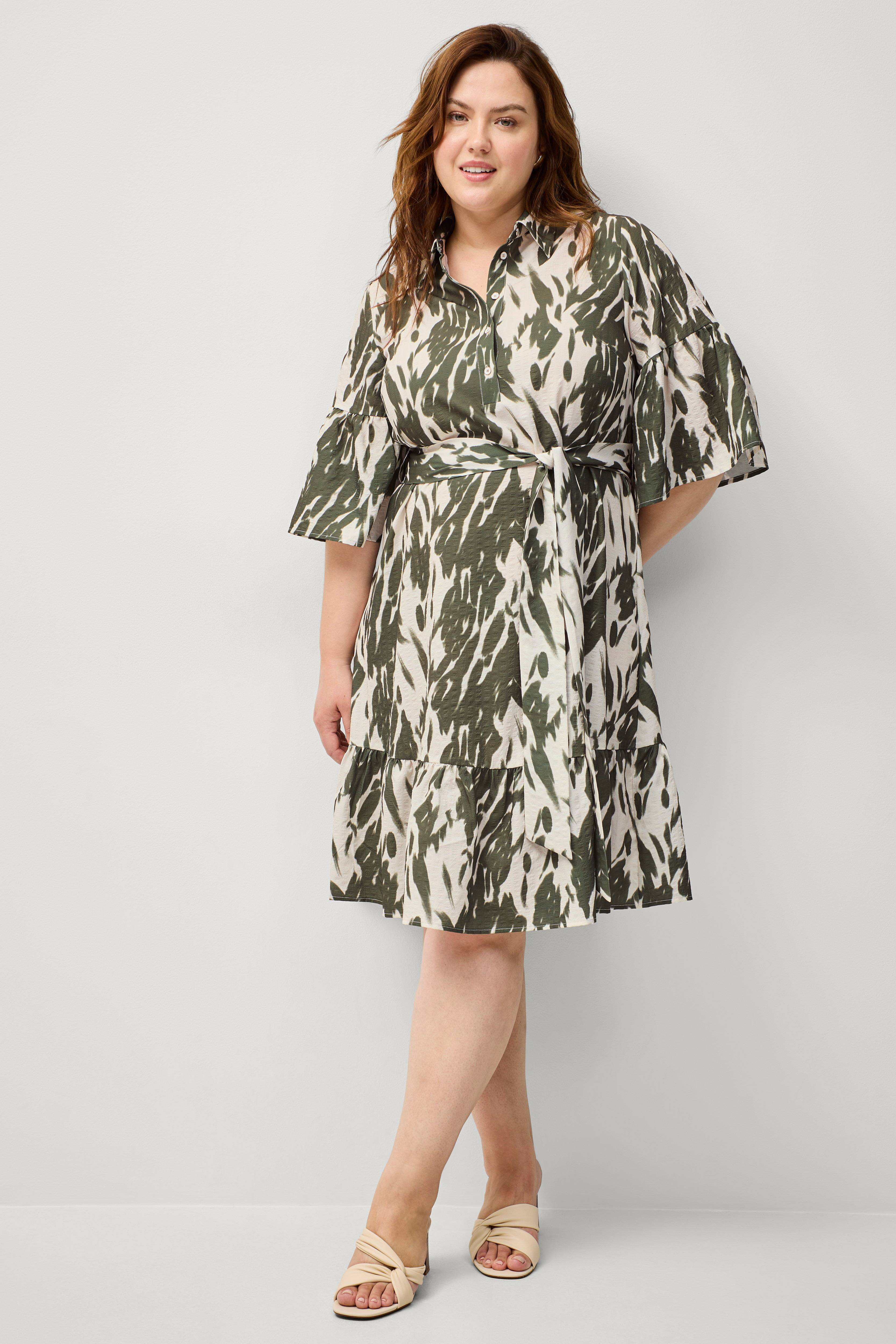 • Store størrelser• Model med svaj med volant ved nederste kant• Skjortekrave• Kort knaplukning foran• 3/4 langt ærme med volant ved manchetterne• Bindebælte ved taljen• Længde: 111 cm i størrelse 42/44