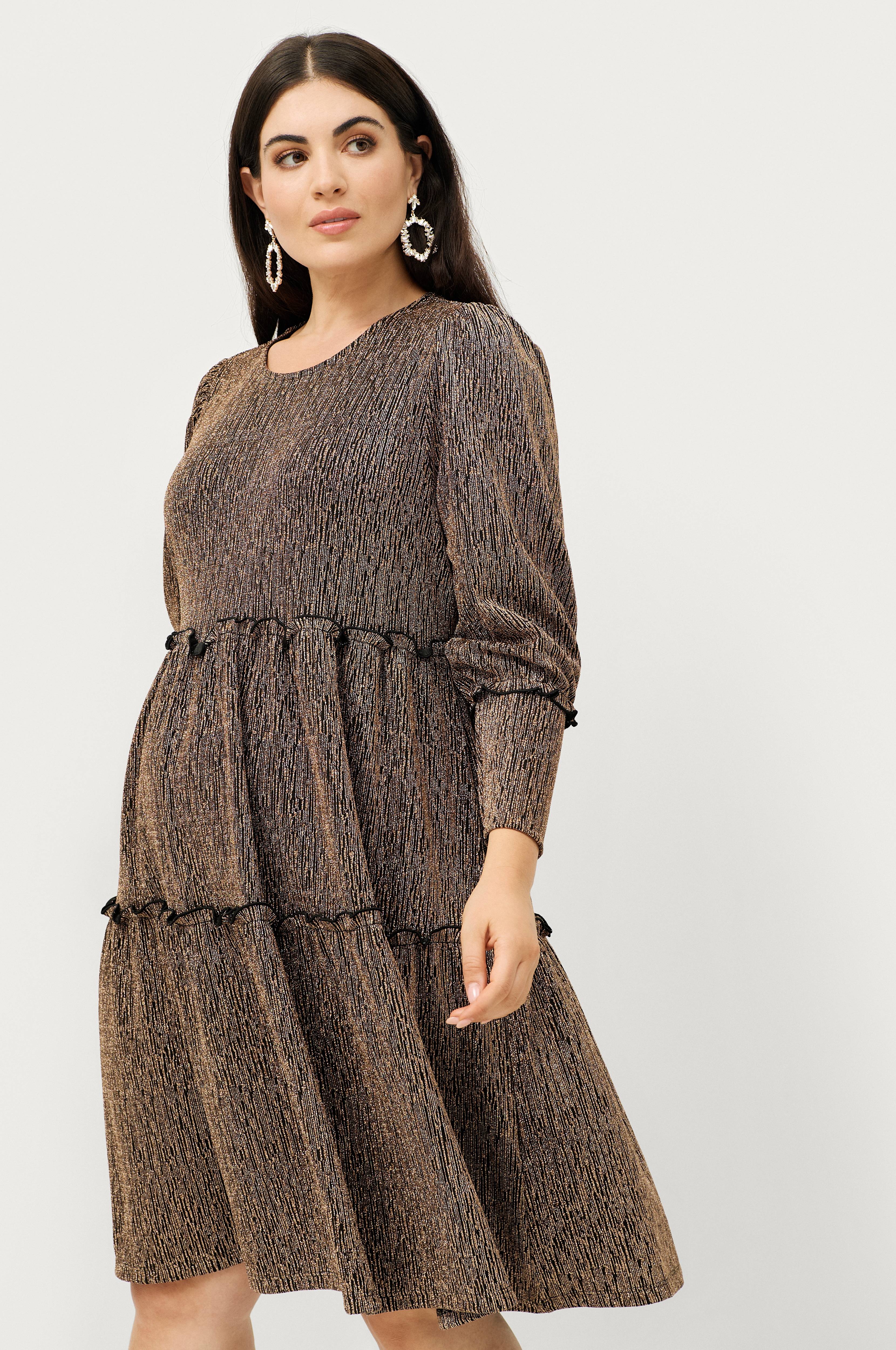 • Guldglitrende kjole i jersey • Model med svaj • Lange ballonærmer med tynd manchet • Volant ved taljen og på skørtet • Længde: 104 cm i størrelse 46/48