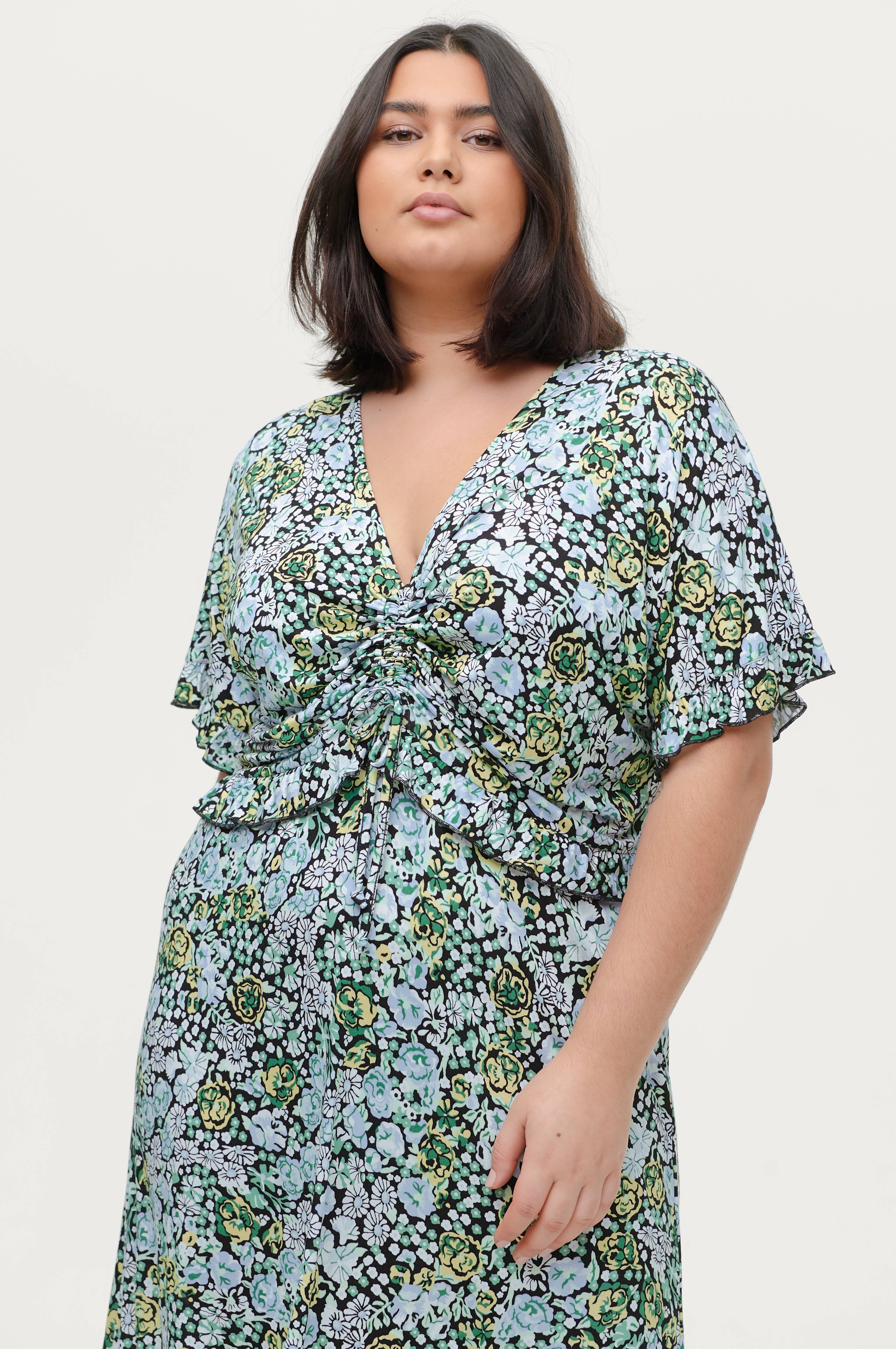 Kjole Bahar i mønstret jersey med flæse i taljen og i ærmekanterne. V-udskæring foran og lodret løbegang for justerbar pasform over brystet. Længde ca. 120 cm i str. 42/44.