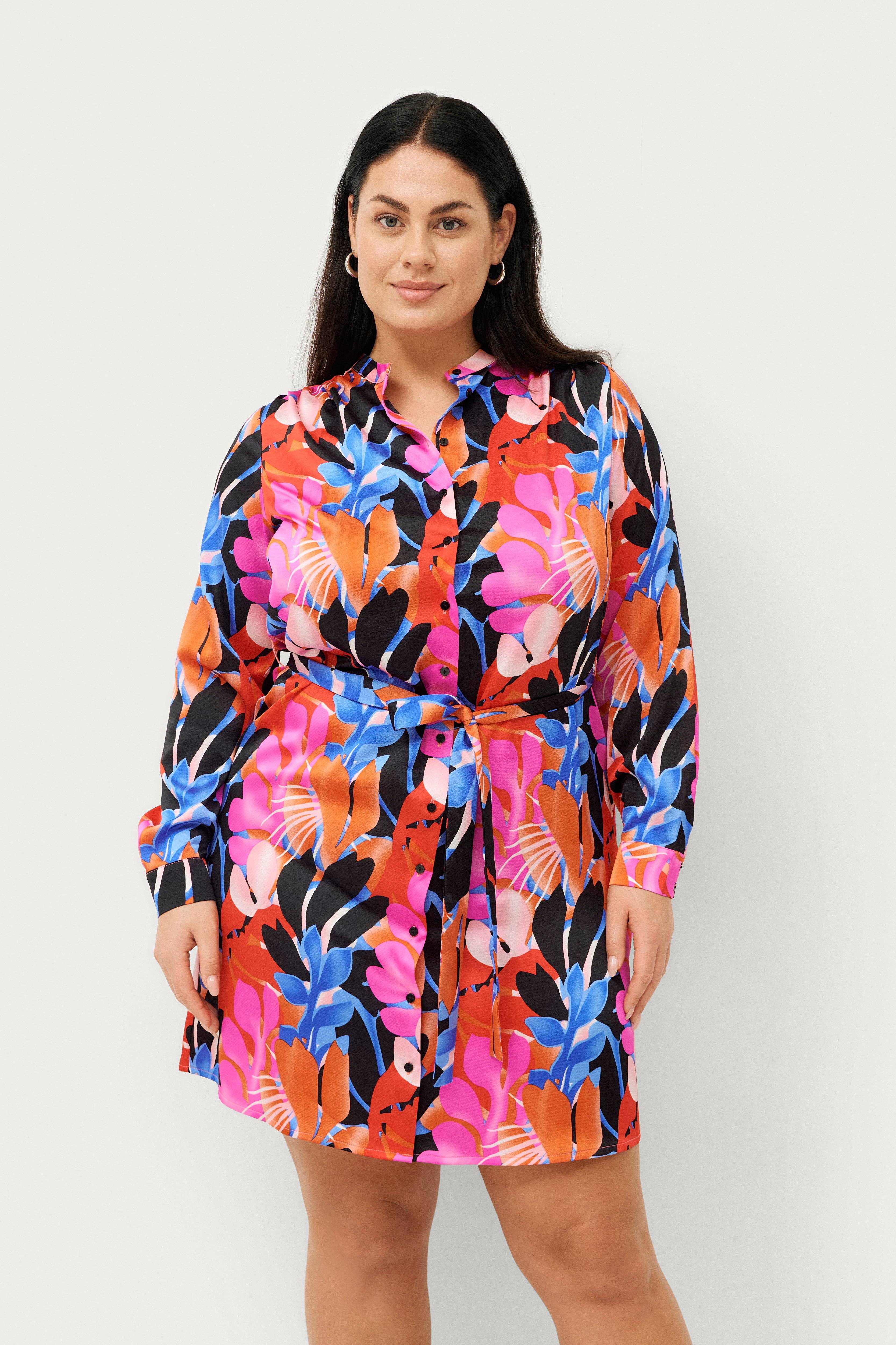 • Farverig kjole • Knapper foran • Bindebælte ved taljen • Lange ærmer med manchet • Samling på skuldrene og i ryggen • Længde: 100 cm i størrelse 42/44