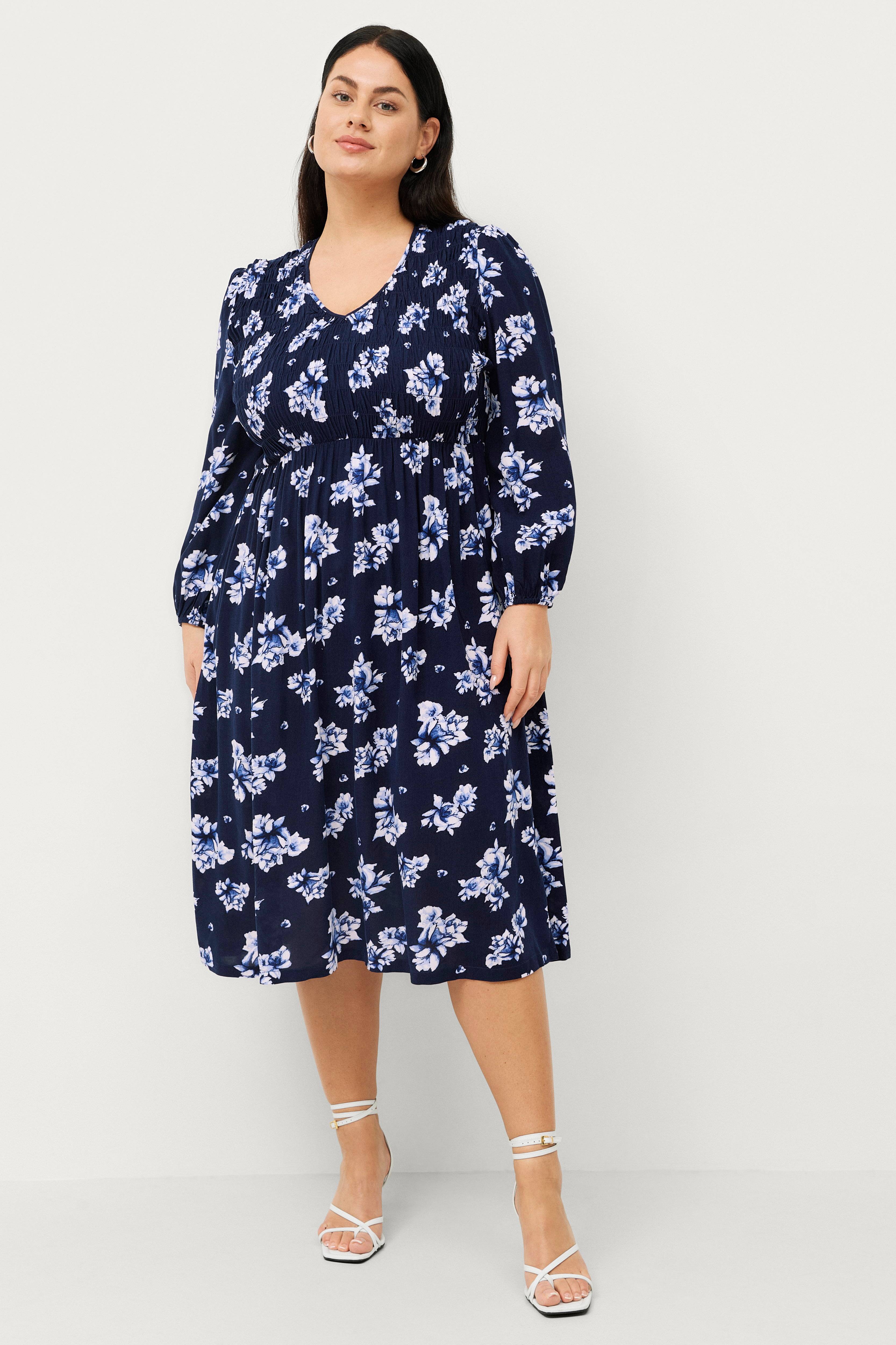 • Store størrelser • Model med svaj • Elastiske sømme på toppen • V-formet halsudskæring • Lange ballonærmer med elastisk manchet • Længde: 118 cm i størrelse 42/44