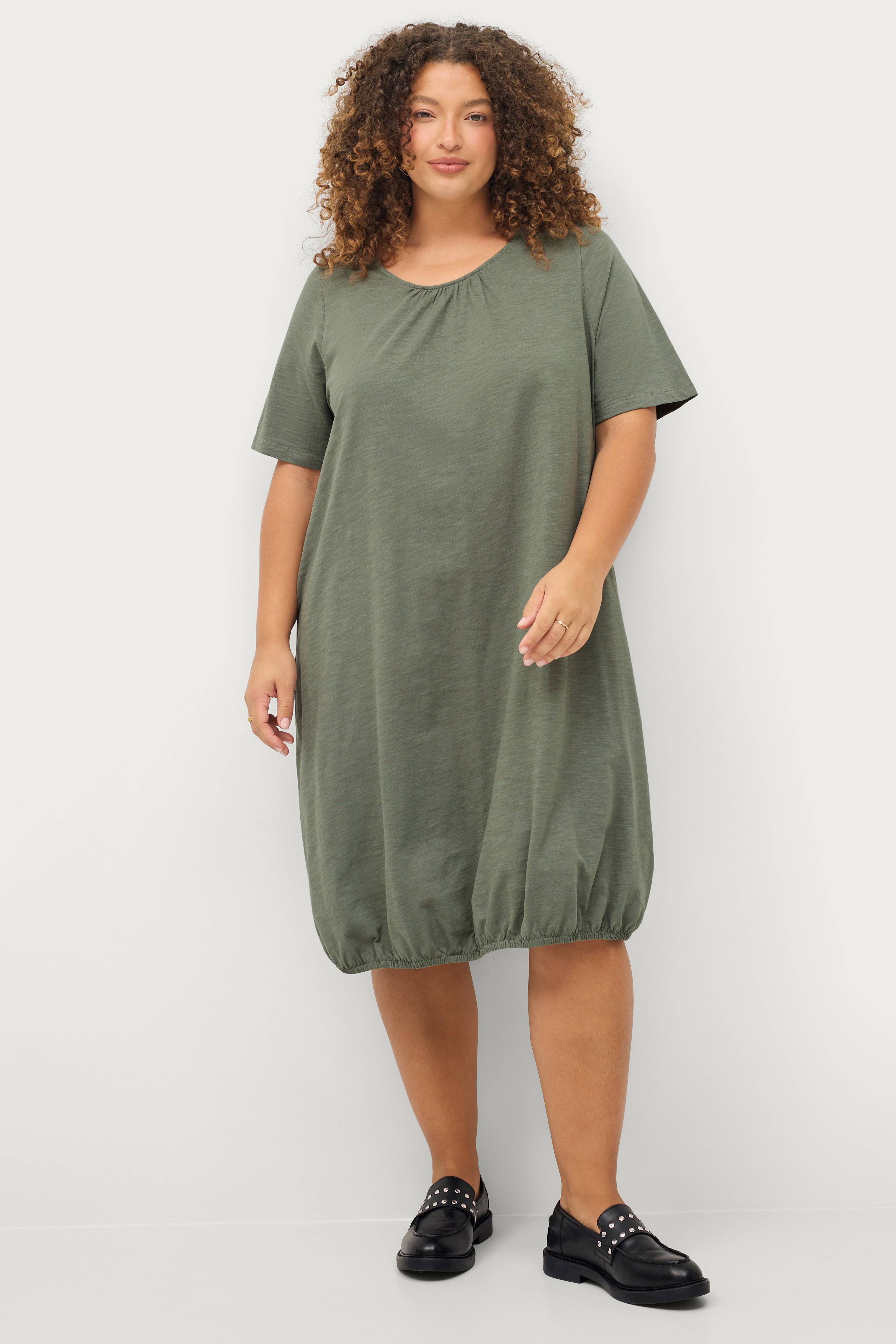Kjole Britt i bomuldsjersey med uregelmæssig slubstruktur. Rund hals med rynkning foran, korte ærmer og elastisk kant forneden. Længde ca. 103 cm i str. 42/44.