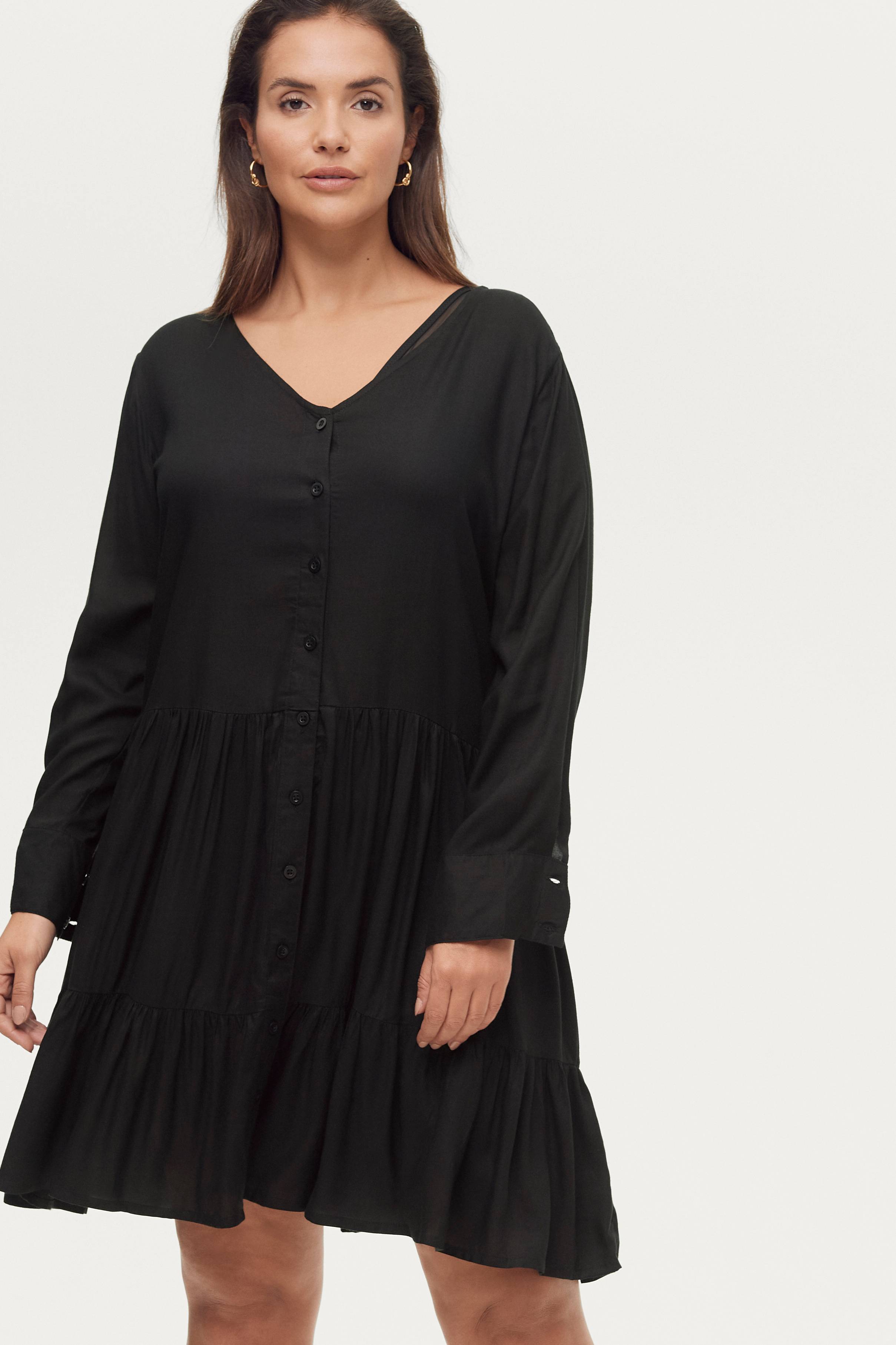 Kjole Fiddelie i A-formet model med løst snit. V-udskæring og gennemknappet foran samt langt ærme med bred manchet i ærmekanten. Afskæring i taljen med vidde i nederdelen som har påsyet flæse forneden. Længde ca. 100 cm i str. 42/44.