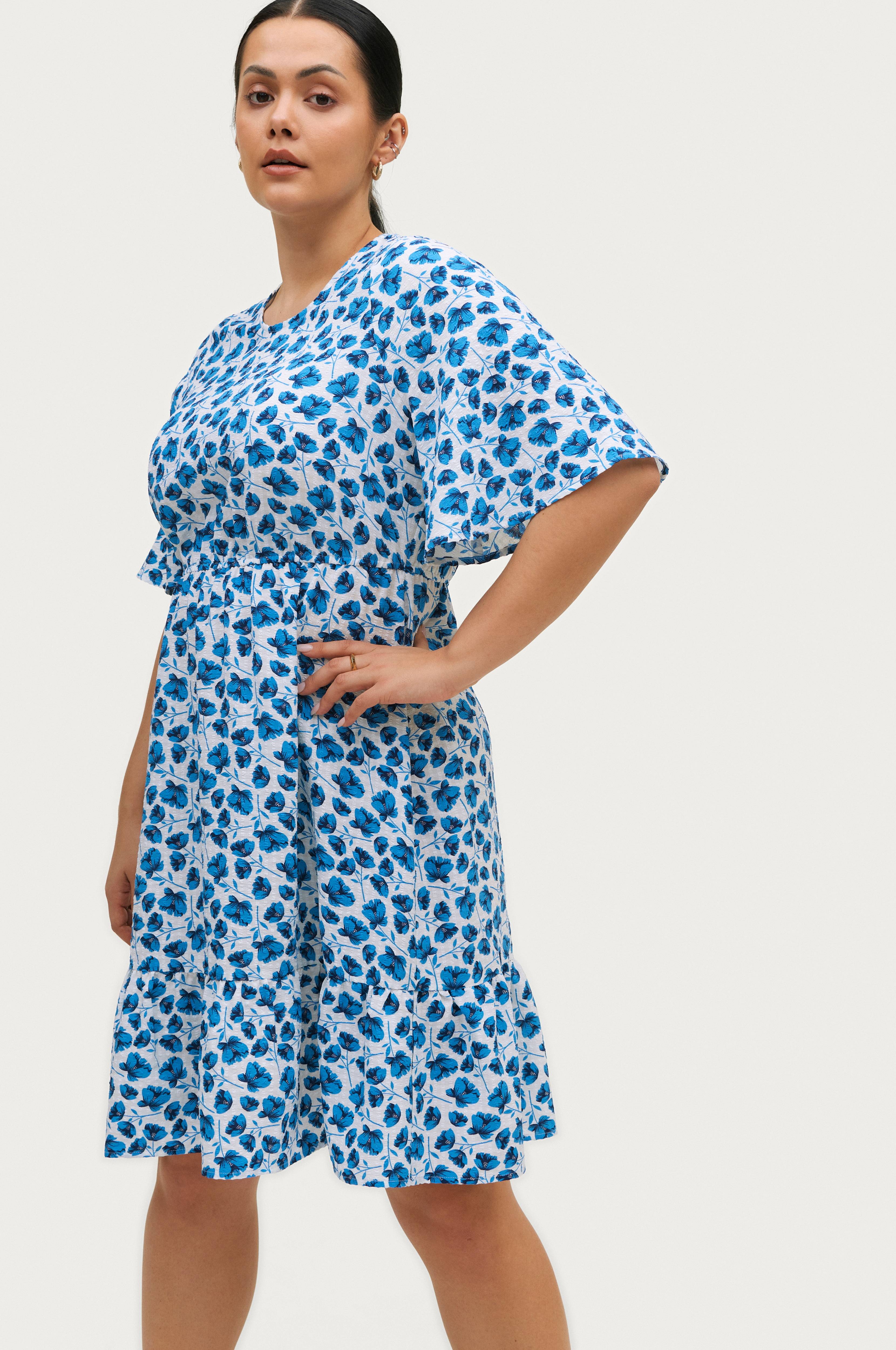 • Rund hals med ventilation og knap bagpå • Halvlange, brede sommerfugleærmer • Elastisk talje • Nederdel med svaj med volant • Vævet kvalitet med struktur • Længde: 107 cm i størrelse 42/44