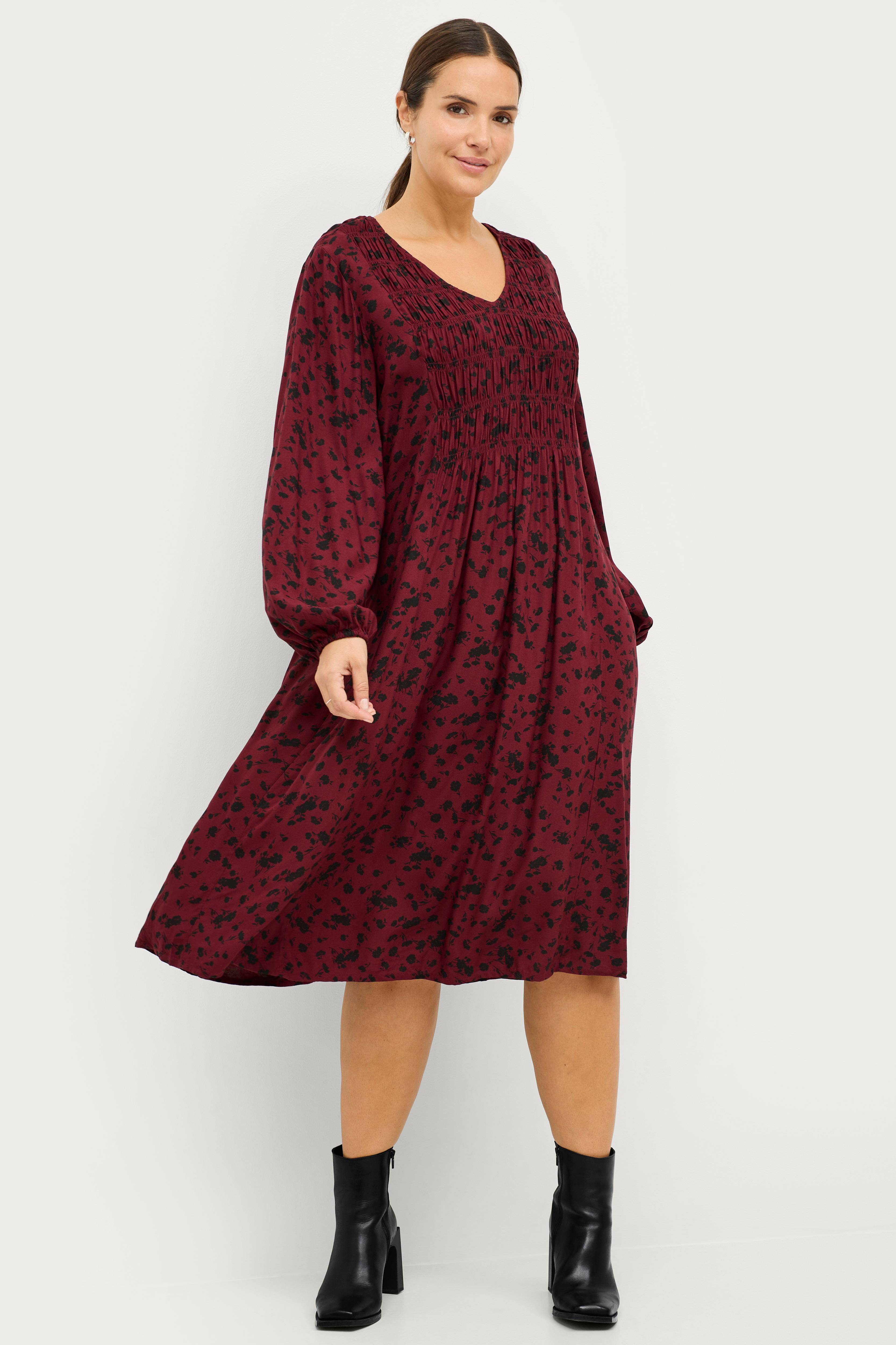 Meget smuk og behagelig kjole, som ikke sidder stramt nogen steder. God model, hvis man ikke er tyndsom en tråd. Sidder pænt, og stoffet falder flot. Man ser ikke ud som 'et telt', som i ma…