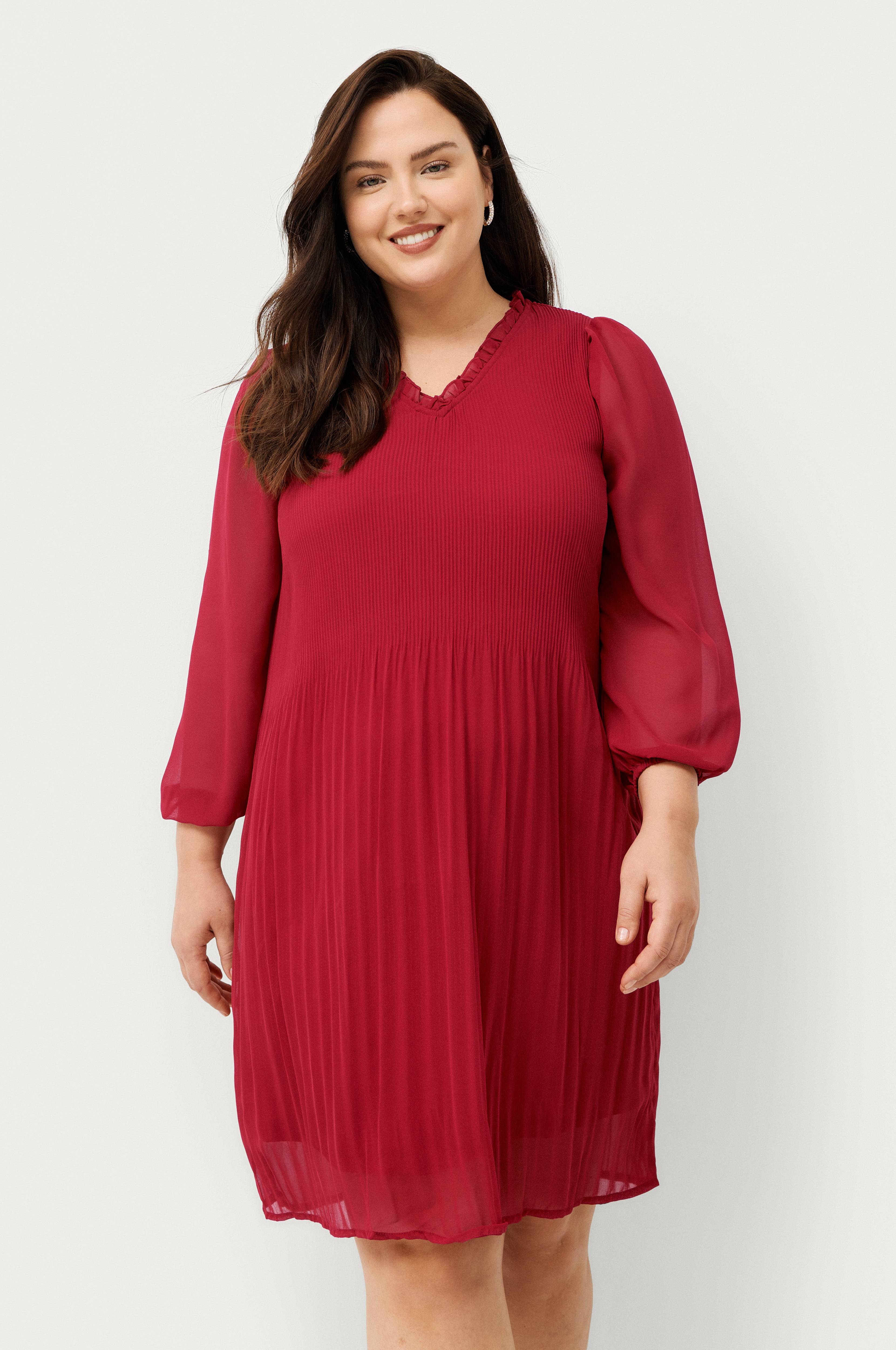 • Plisseret kjole i chiffon • V-udskæring med volant • Lidt kortere, transparente ærmer med elastiske manchetter • Trikotfor • Længde: 103 cm i størrelse 42/44
