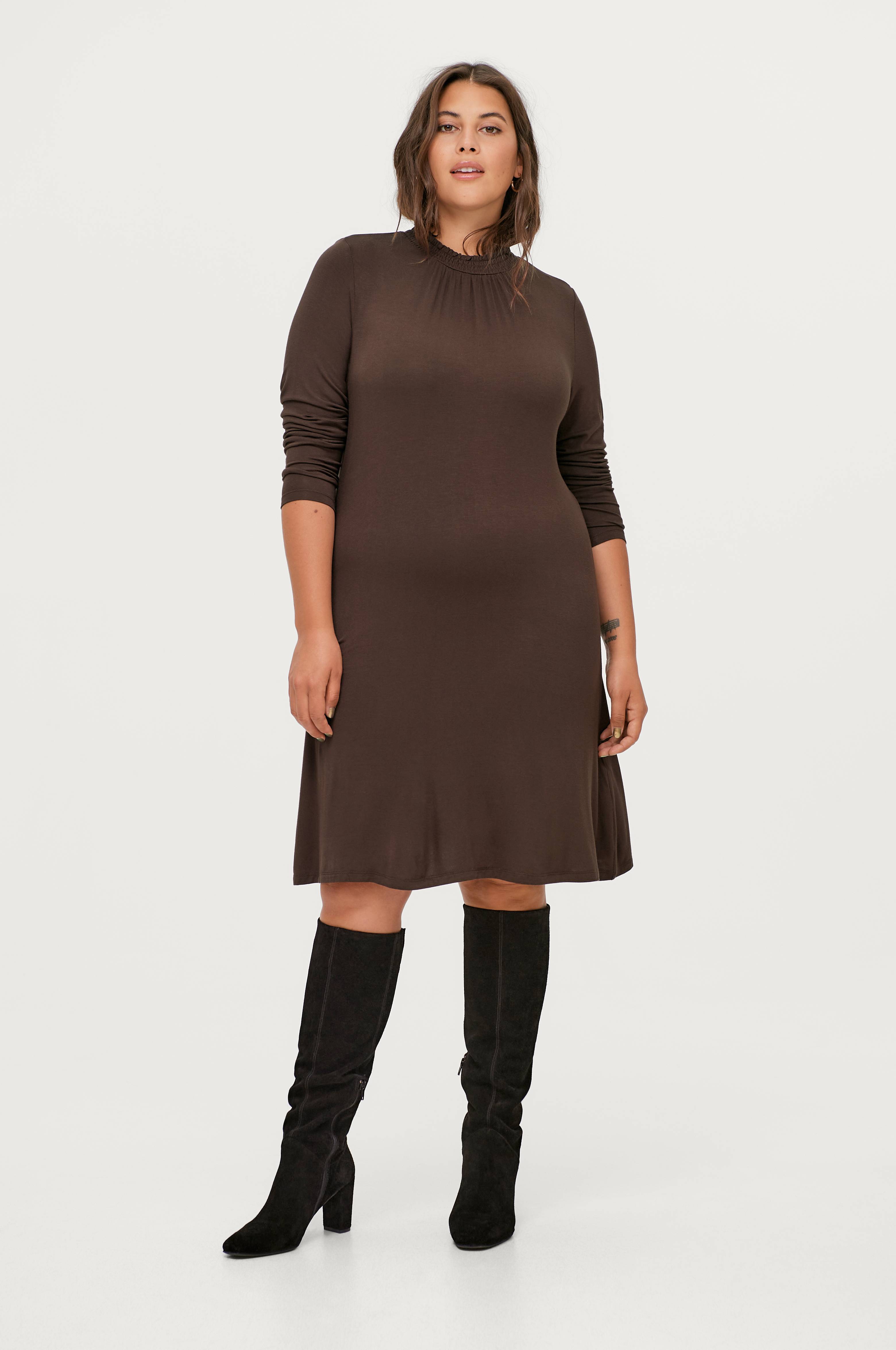 Kjole Gry i tynd, blød jersey med smock i halsudskæringen. Let a-formet model med lange ærmer og slids og knapper i nakken. Længde ca. 101 cm i str. 42/44.